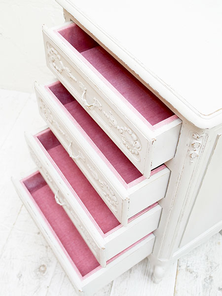 フレンチ ペイントチェストとドレッサーの引き出しにモケット生地で内張りをしてお届けいたしました。