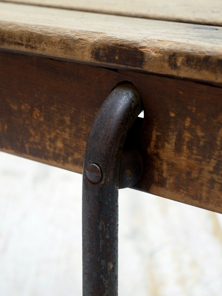 推定1950年代、イギリス製のインダストリアルデザインのアンティークベンチです。同じデザインのベンチが8台あり(スタッキングができます)、ショップのディスプレイ用にも最適です。ダイニングテーブルのベンチとしてのご使用ももちろんですが、幅が大きくご自宅での使用を考えると、当時なかったテレビ台としてのご使用もおすすめです(写真9枚目 合わせたボックスKR86)。