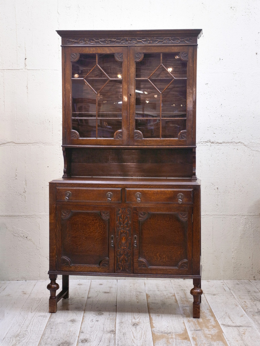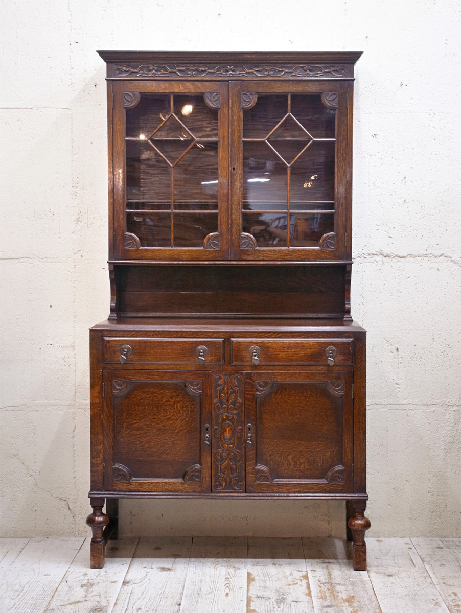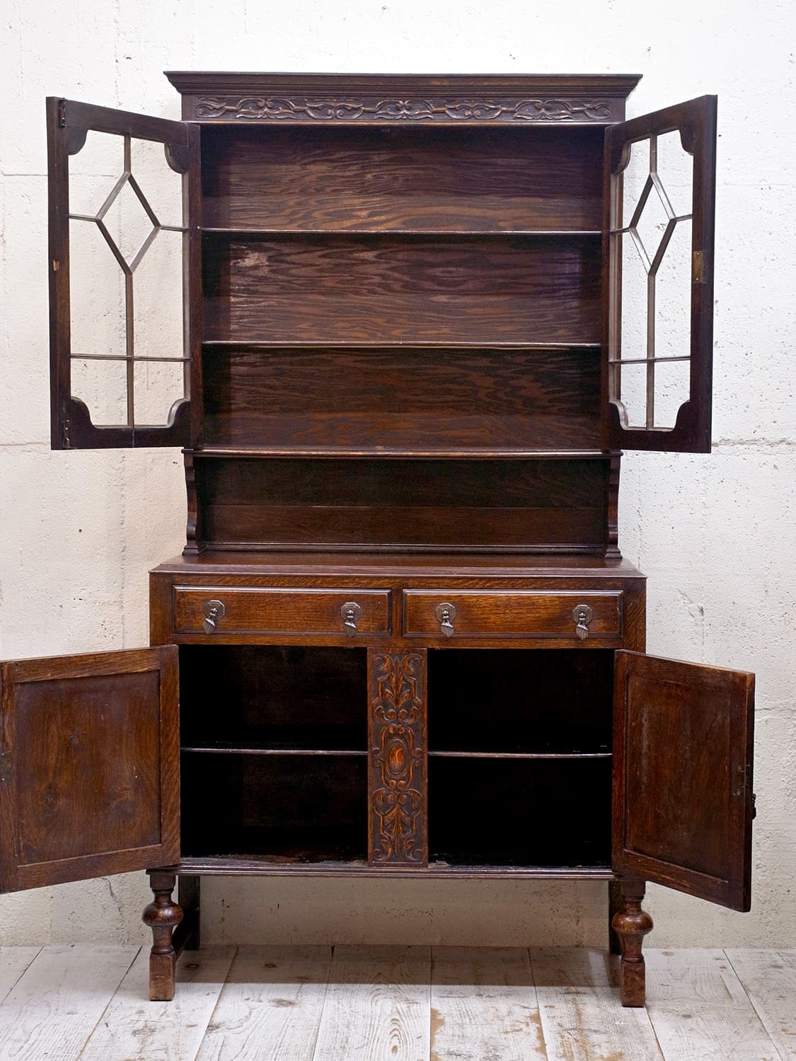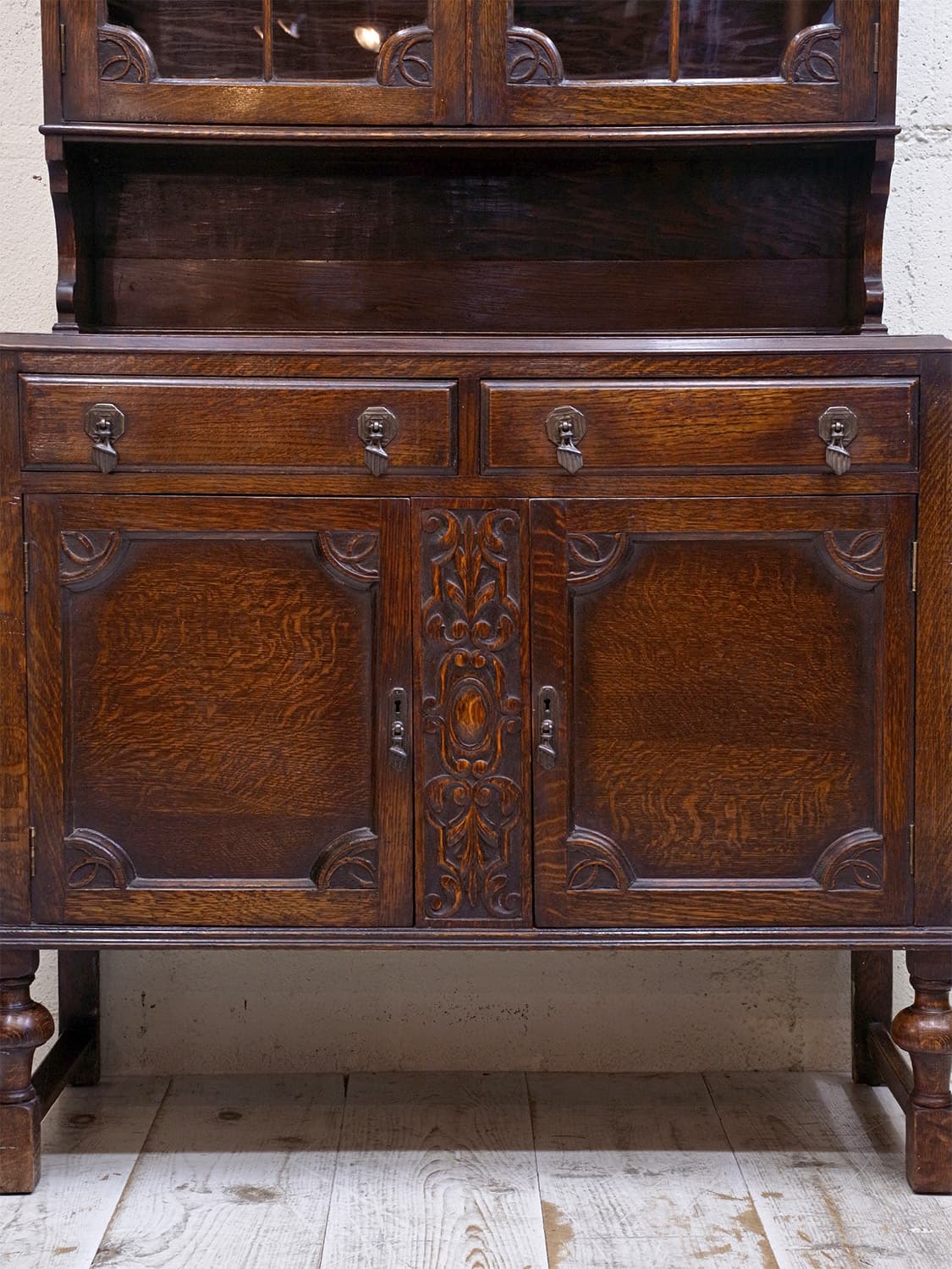 推定1930年代、イギリス製のアンティークオークキャビネットです。イギリスのキッチン横に置いてあるスタンダードなキャビネット(食器棚)で上台と下台に分かれる作りです。装飾性があり華やかですが、使い勝手も良くおすすめです。引き出し内寸 W435 D340 H85mm。その他オークキャビネットはこちらから。