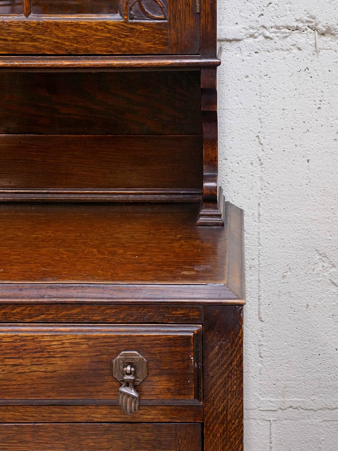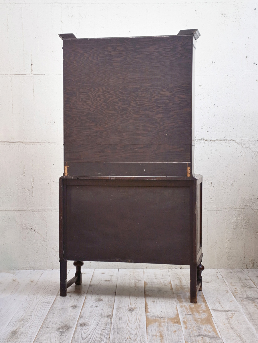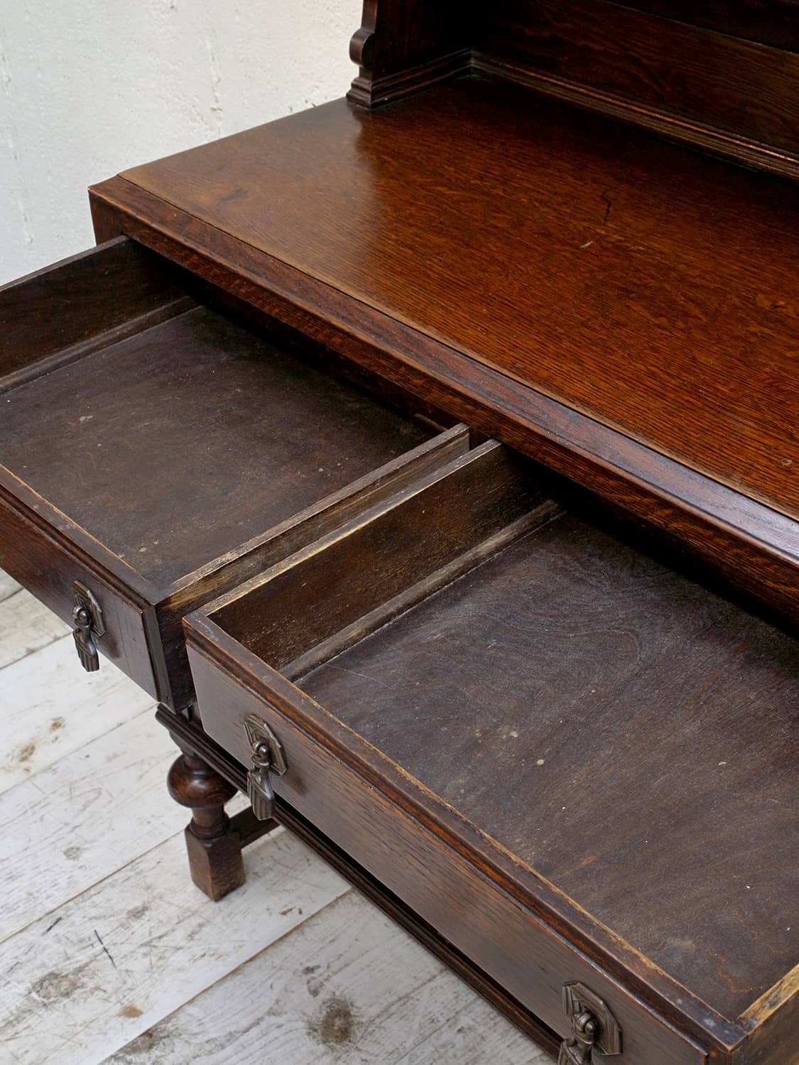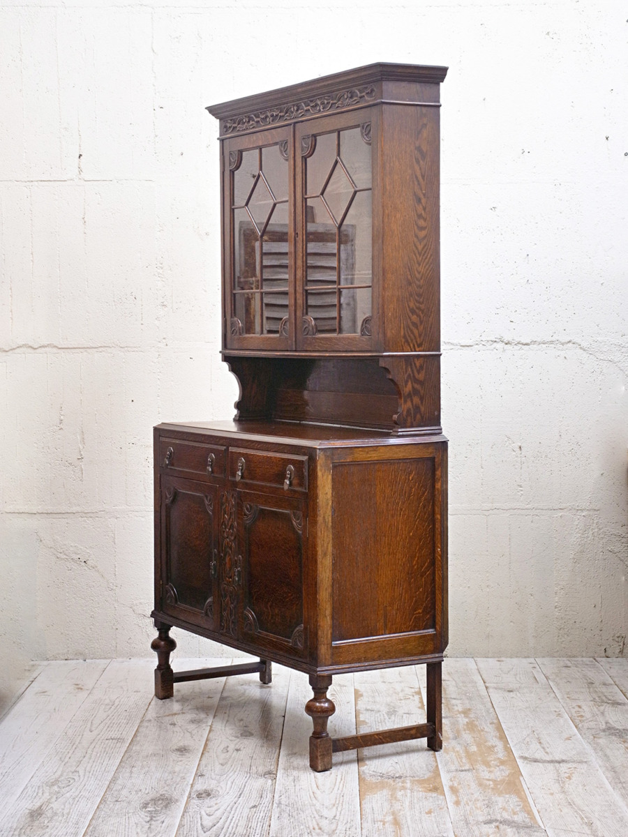 推定1930年代、イギリス製のアンティークオークキャビネットです。イギリスのキッチン横に置いてあるスタンダードなキャビネット(食器棚)で上台と下台に分かれる作りです。装飾性があり華やかですが、使い勝手も良くおすすめです。引き出し内寸 W435 D340 H85mm。その他オークキャビネットはこちらから。