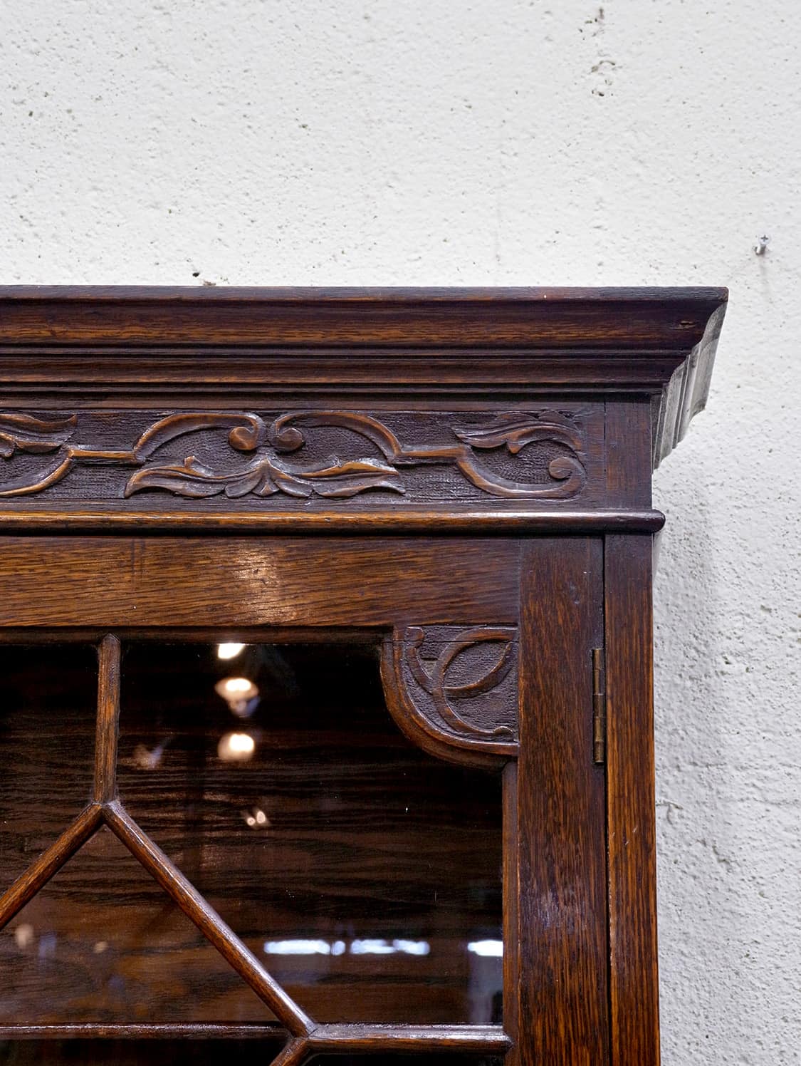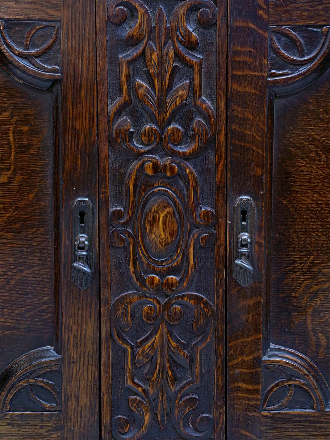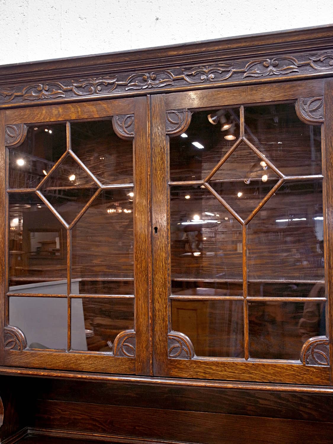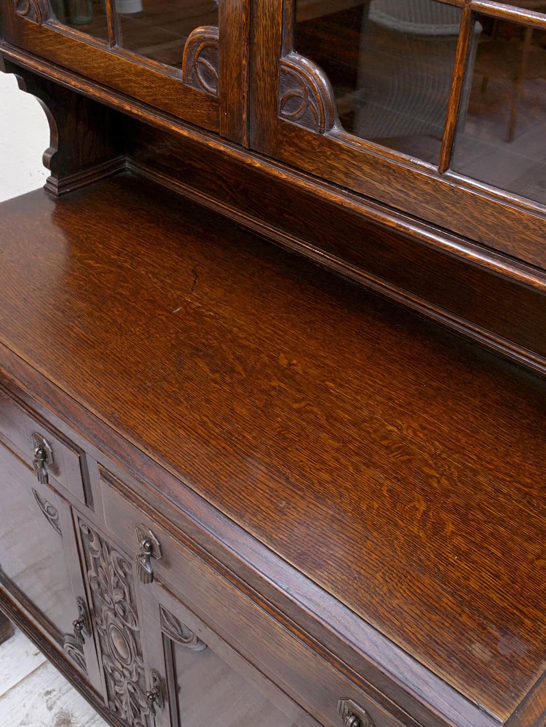 推定1930年代、イギリス製のアンティークオークキャビネットです。イギリスのキッチン横に置いてあるスタンダードなキャビネット(食器棚)で上台と下台に分かれる作りです。装飾性があり華やかですが、使い勝手も良くおすすめです。引き出し内寸 W435 D340 H85mm。その他オークキャビネットはこちらから。