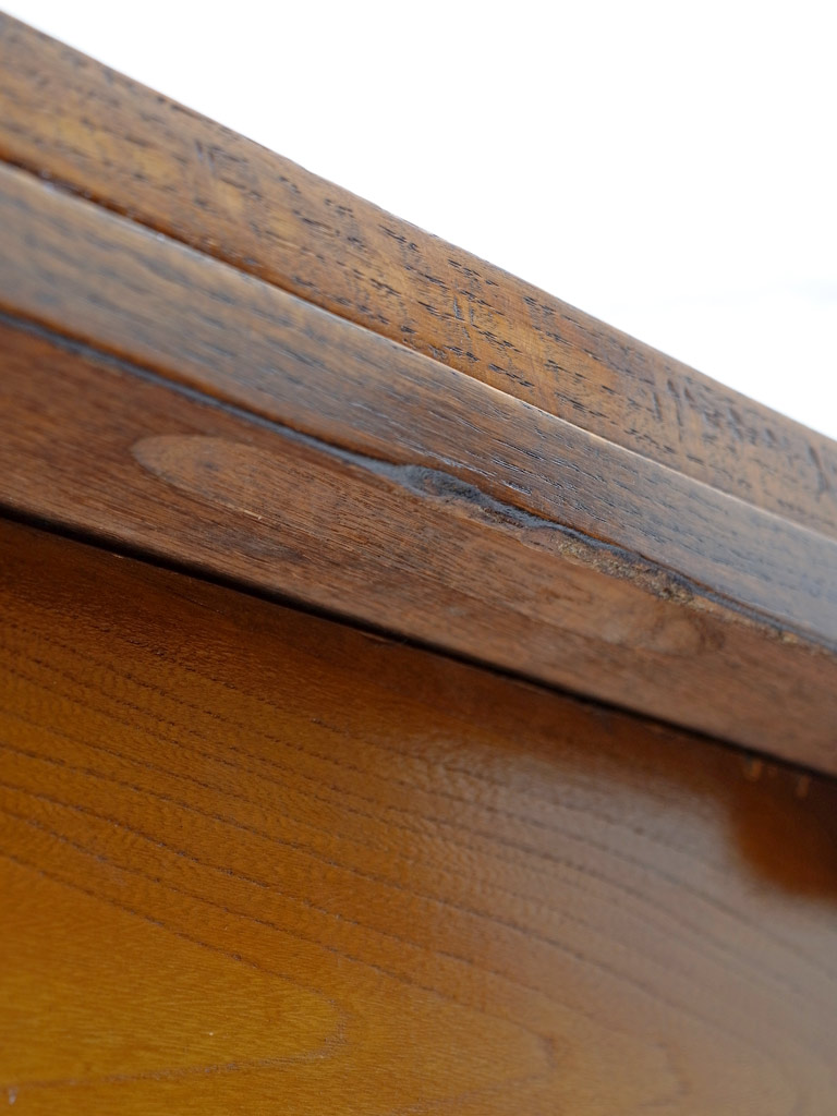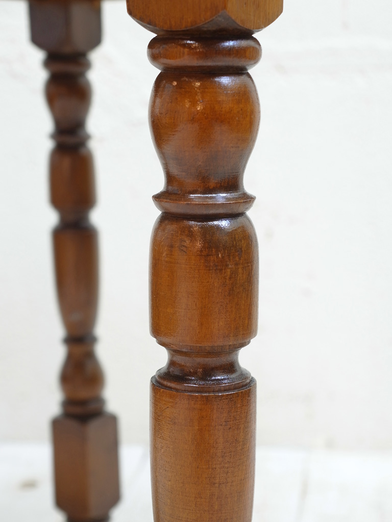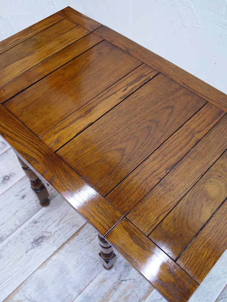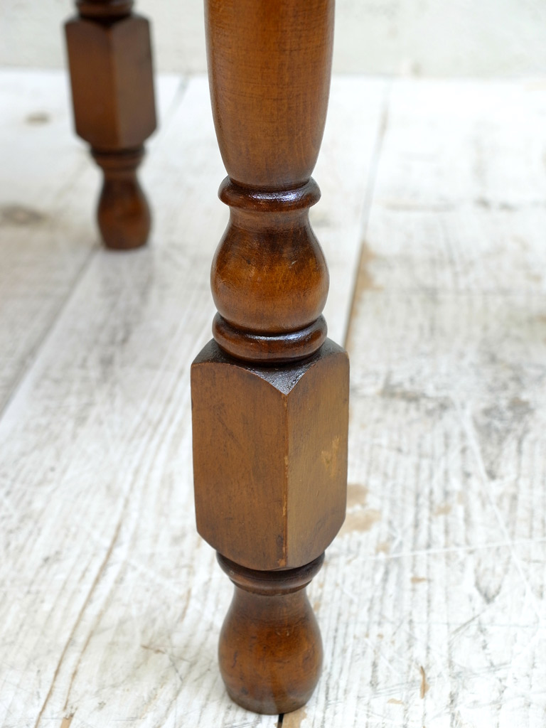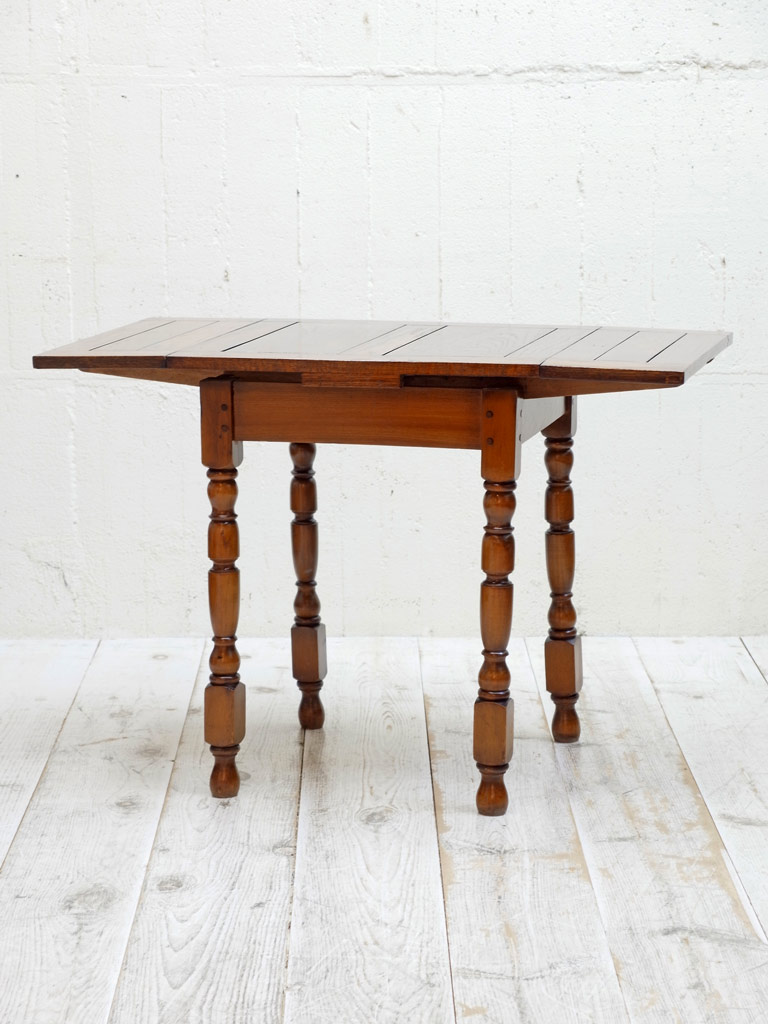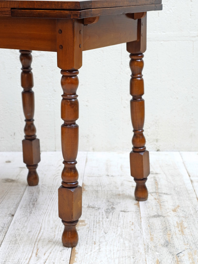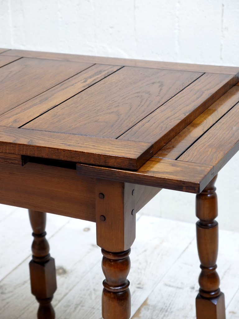 推定1940年代、イギリス製のアンティークオークスモールドローリーフテーブルです。リーフを伸ばさないときは61㎝です。イギリスの伝統的なダイニングテーブルの一つのテーブルですが、一般的なドローリーフテーブルより一回り小さなサイズ感で1〜2人暮らしの方におすすめのテーブルです。来客時に天板を広げるといった機能的な使い方ができます。天板を塗り直ししているので状態は良好です。その他ドローリーフテーブルはこちらから。