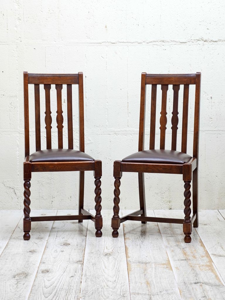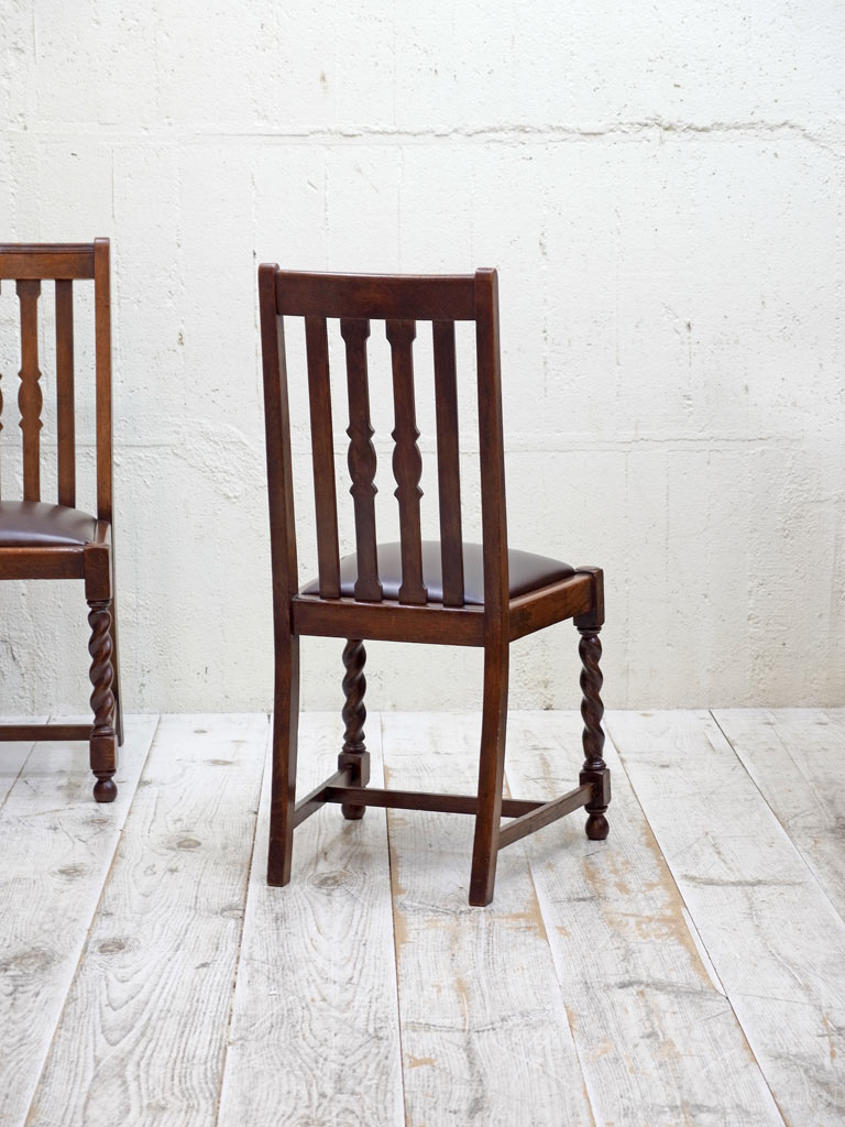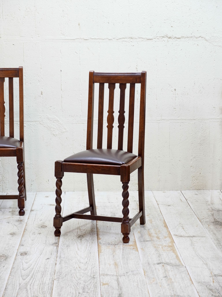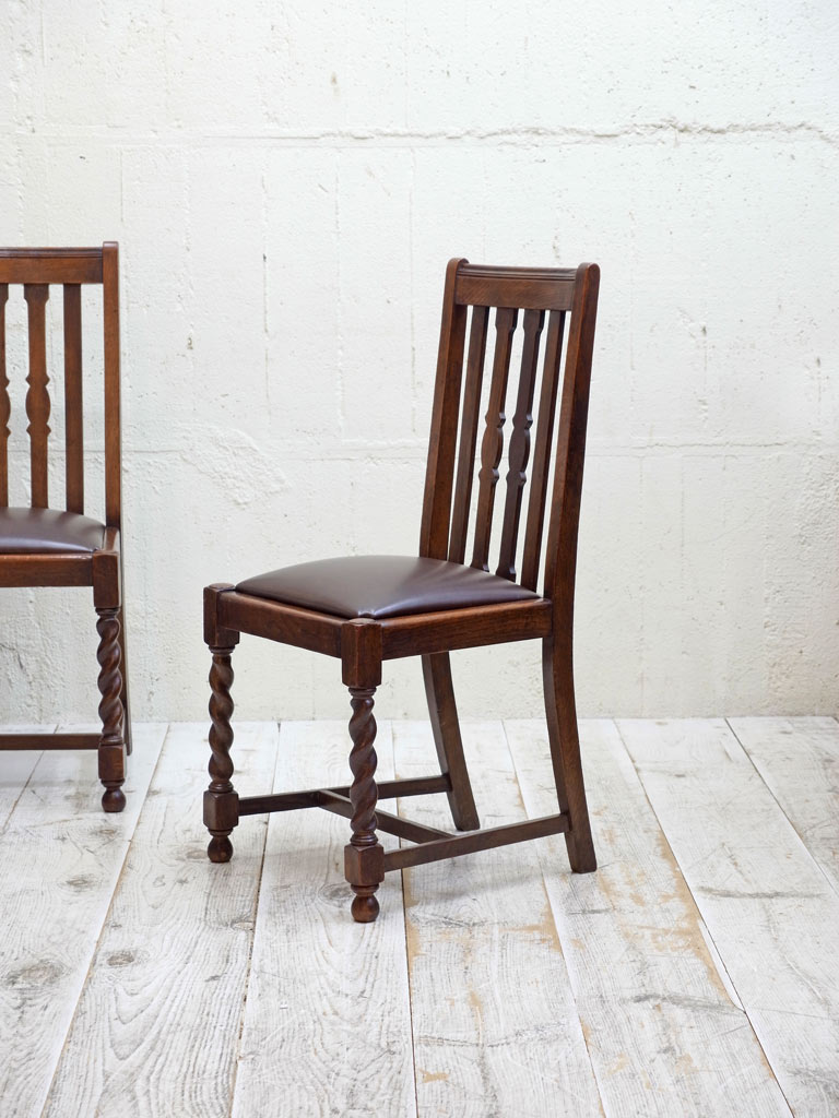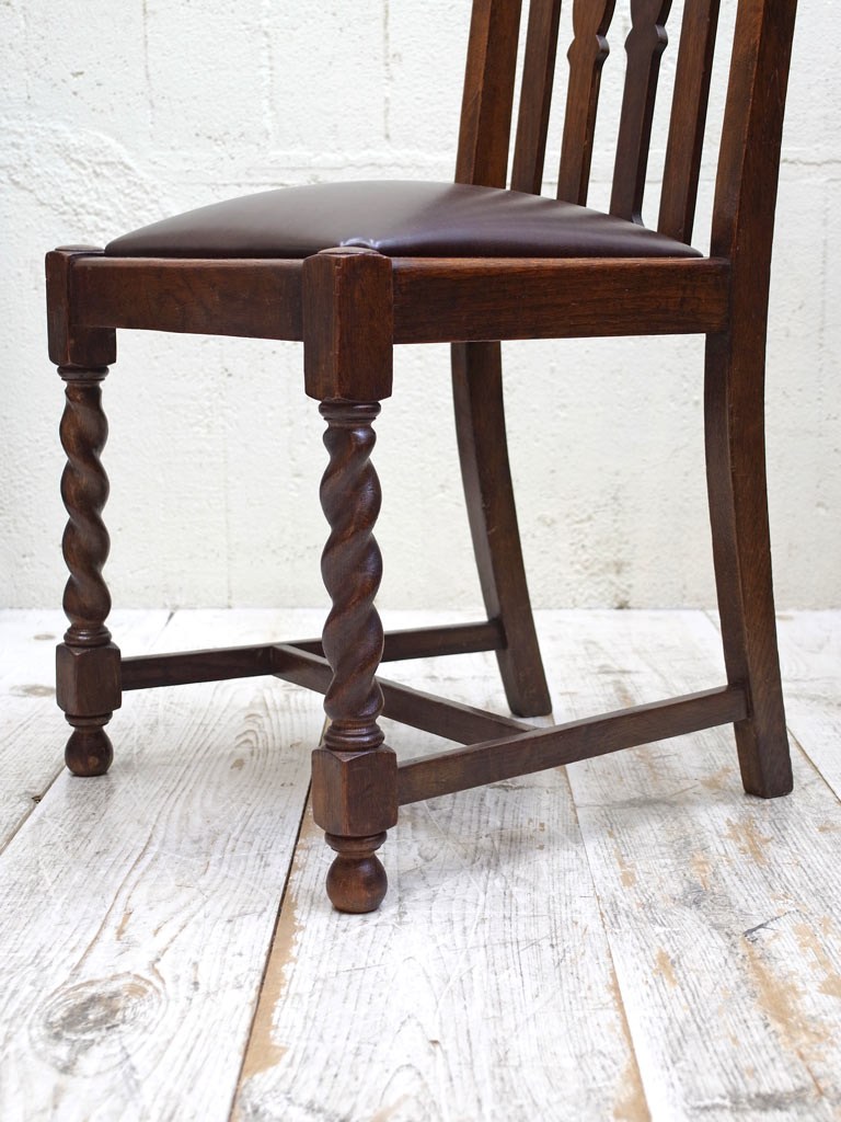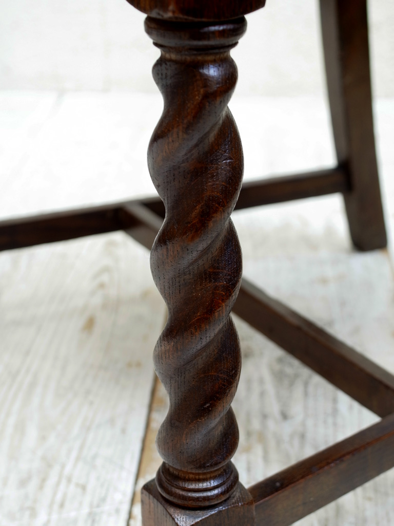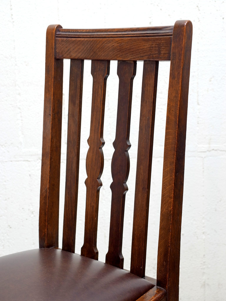 推定1930年代、イギリス製のアンティークオークチェアです。アンティークのダイニングチェアとして定番のスタイルで座面は落とし込みタイプです(簡単に取り外しができます)。入荷後に合成皮革で張り替えています。同素材のドローリーフテーブルと合わせてのご使用もおすすめです。その他オークチェアの一覧はこちらから。