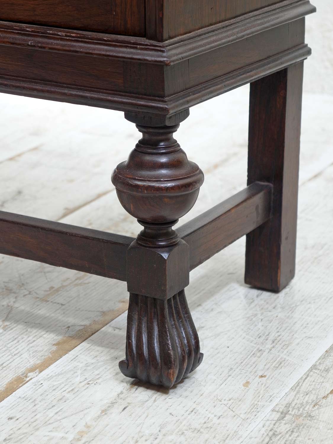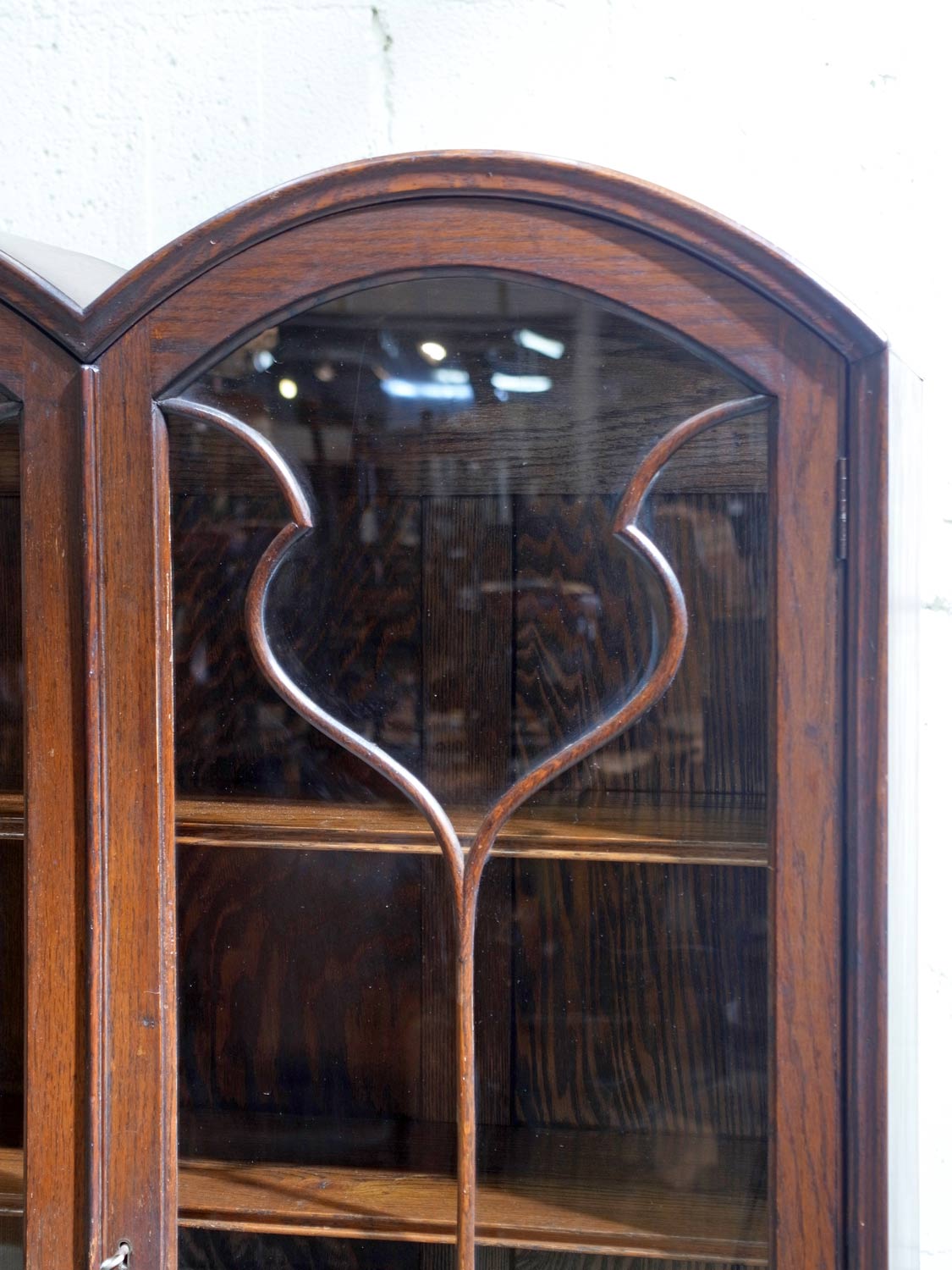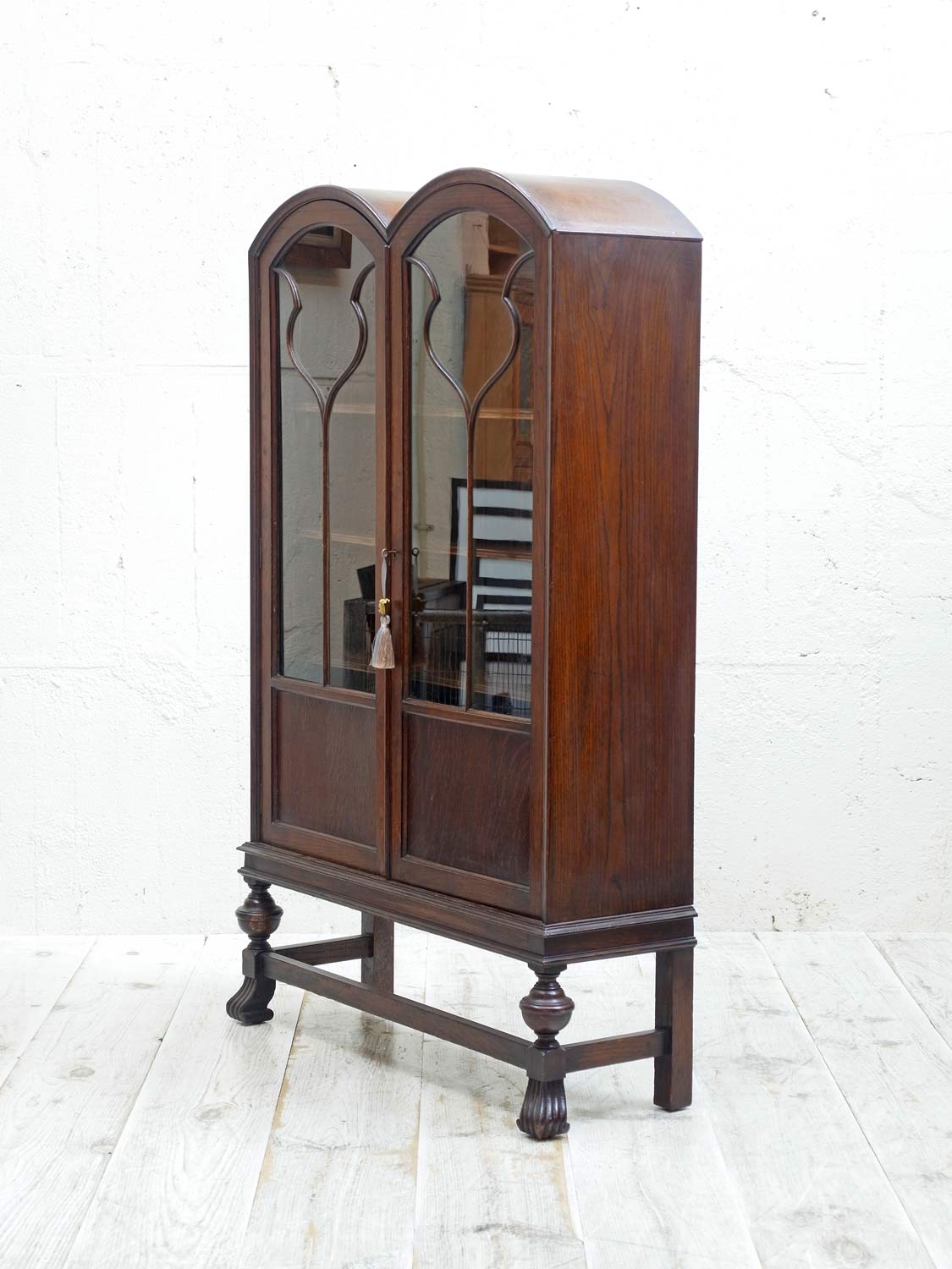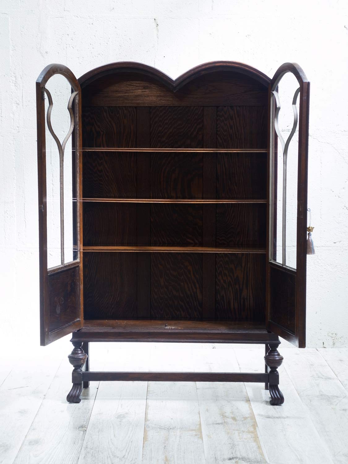 推定1930年代、イギリス製。 扉内寸 W825 D225 H3.5㎝ピッチで可動できます。 独特なデザインが印象的なオークキャビネットです。ブックケースとしてのご使用はもちろん、お皿などの収納キャビネットとしてのご使用もおすすめです。