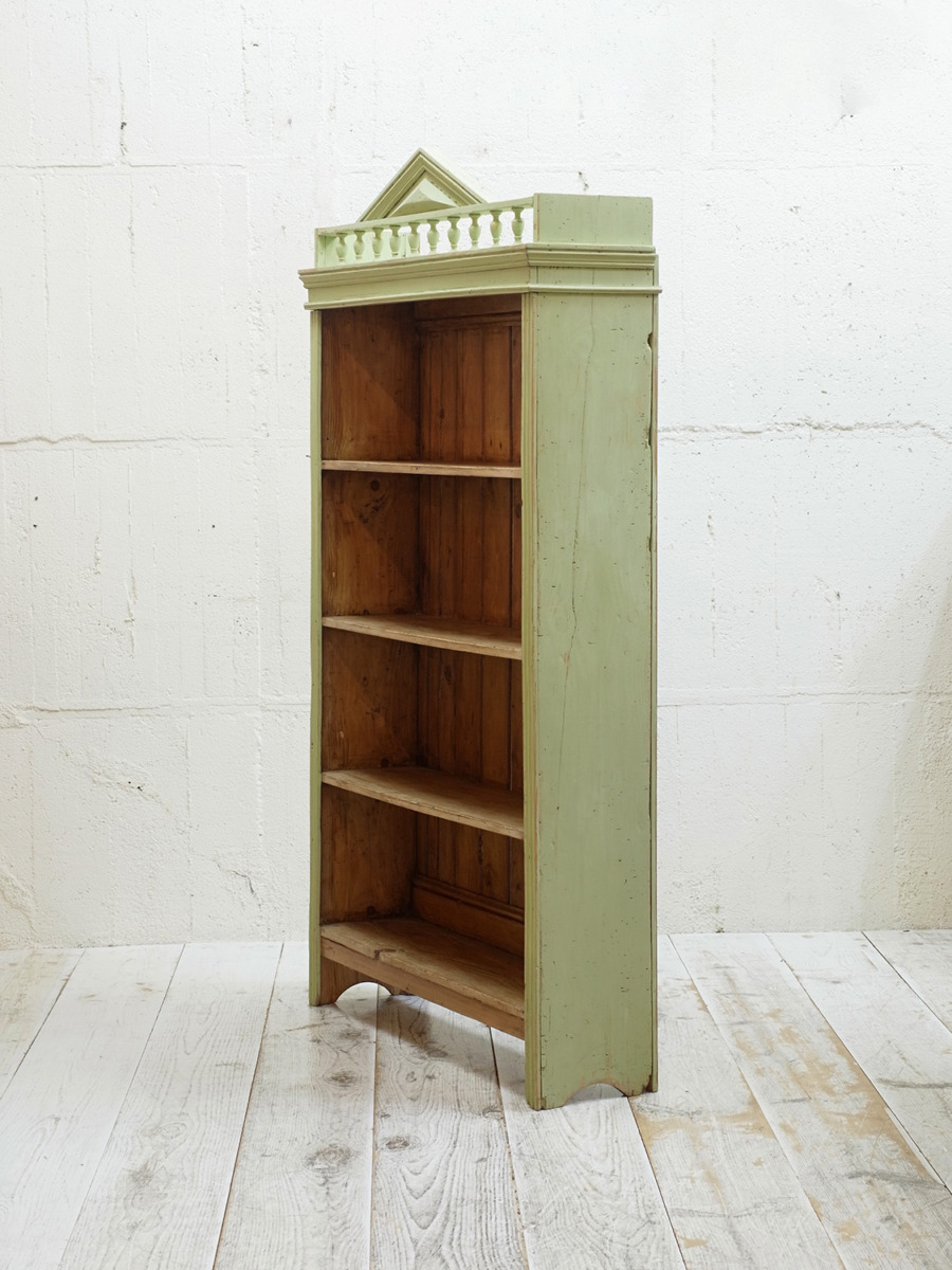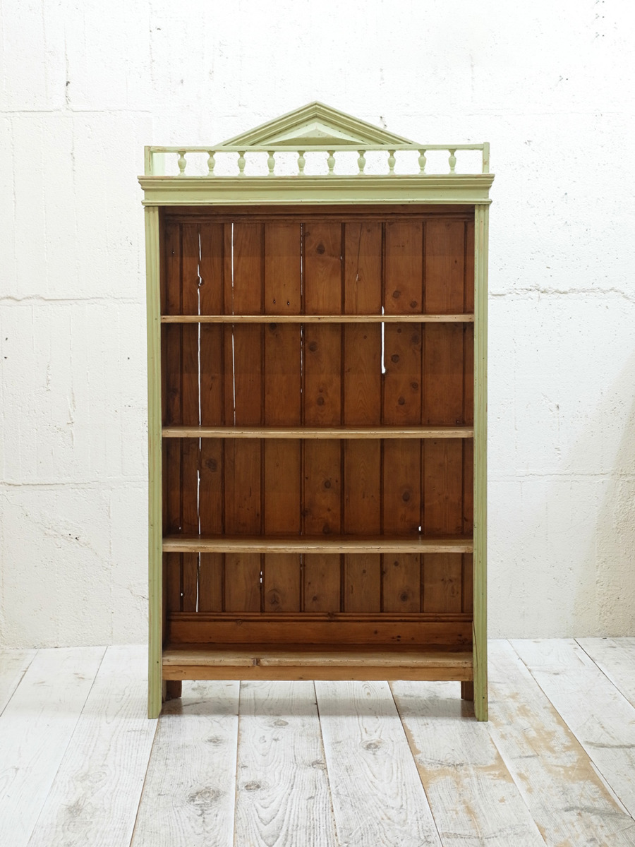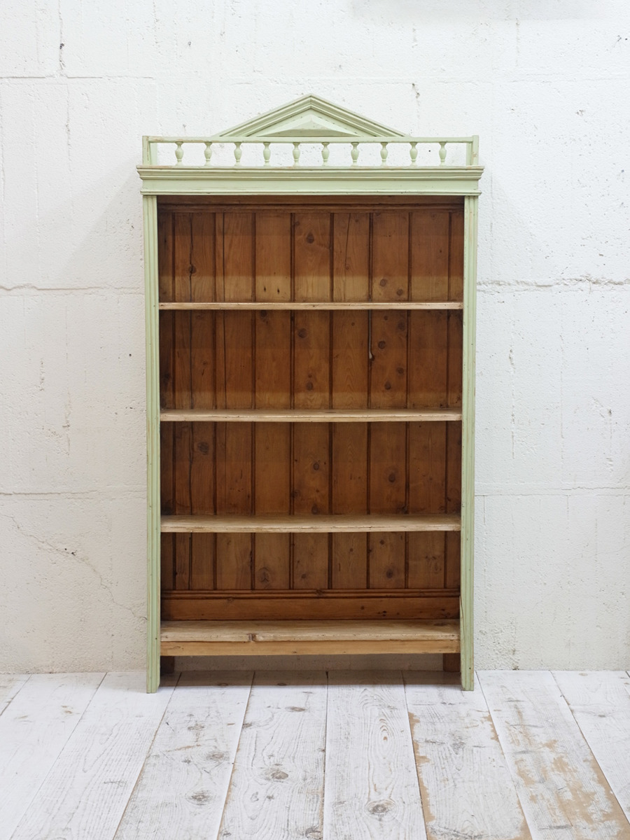 推定1930年代、イギリス製のアンティークペイントシェルフです。ペイントの剥がれがシャビーなシェルフです。ショップ用のディスプレイ棚にもお薦めですし、本棚としてはサニタリー用にタオルなどの収納としてのご使用もおすすめです。ペイントはミントグリーン。子供部屋などにもおすすめです。棚板は全て固定です。棚板内寸 W900 D235 Hそれぞれ300mm。その他ペイント家具はこちらから。