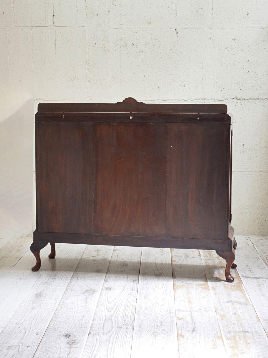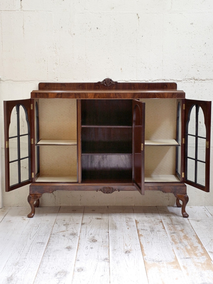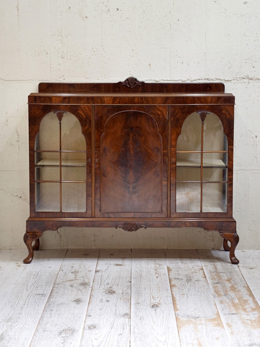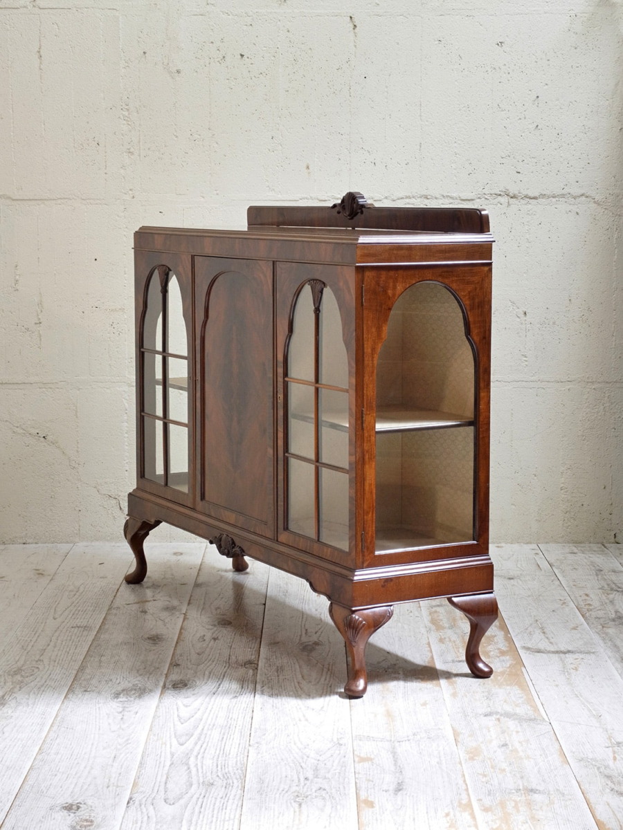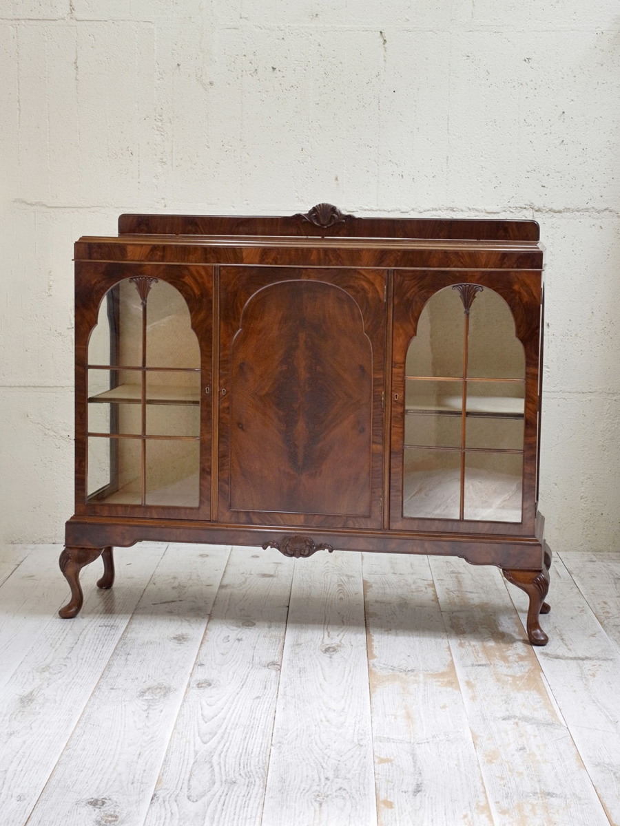 推定1920年代、イギリス製のアンティークウォルナットキャビネットです。重厚感のあるキャビネットで、アーチ型の扉が印象的で左右は側面もガラスがあるため飾ったものが映えます。ディスプレイと収納どちらもできて、リビングなどに置いてご使用いただくのがおすすめです。張地はオリジナルのままで所々にシミが見られますが張替も承れます(別途加工代がかかります)。扉内寸 左右W360 D340 H385/315mm。中央 W460 D340 H230/H225/H240mm。その他ショーケースはこちらから。