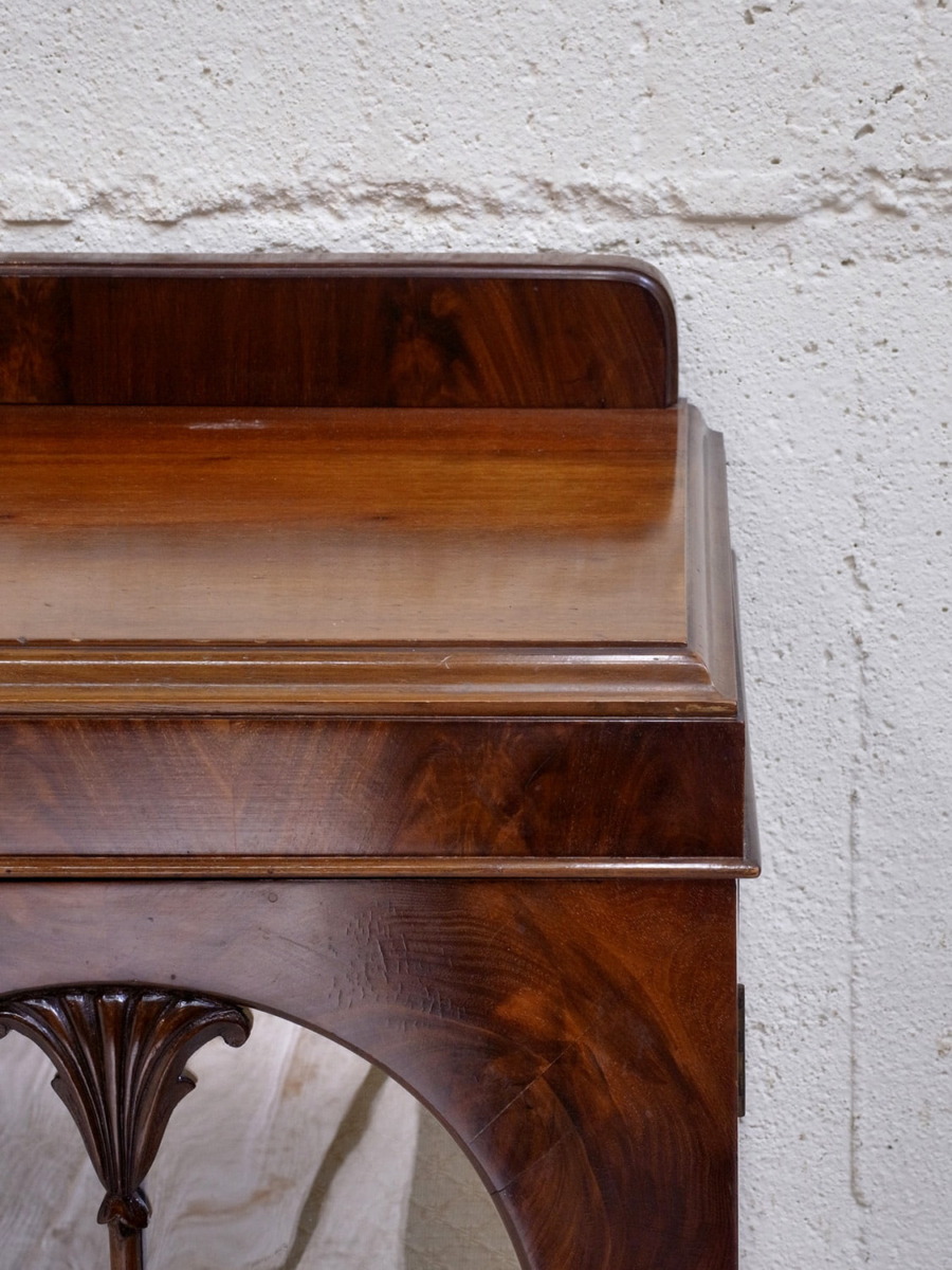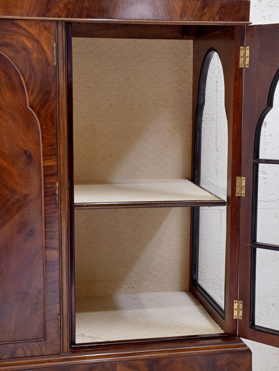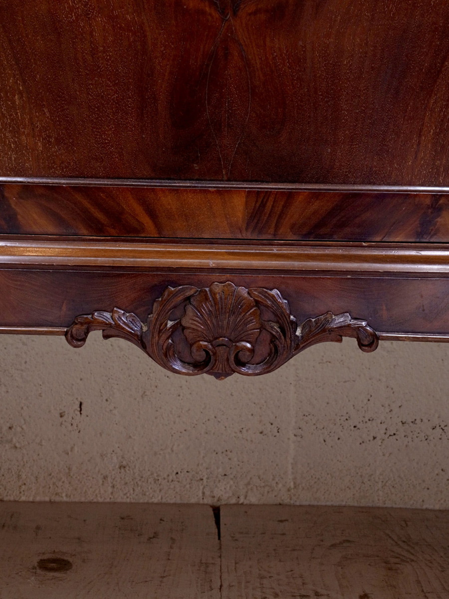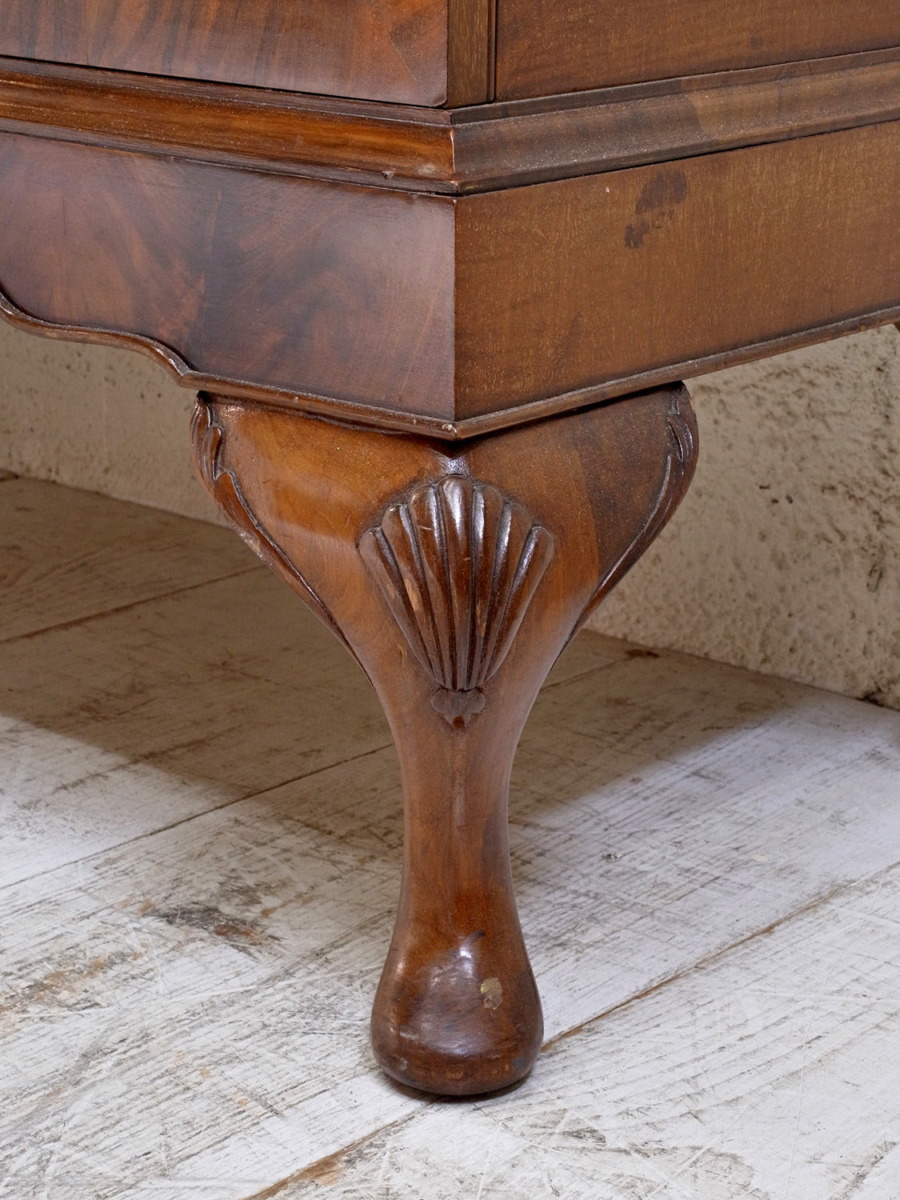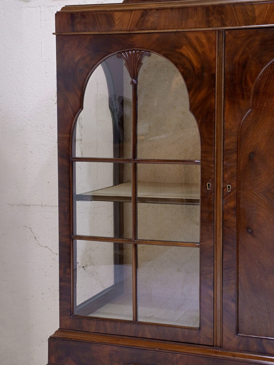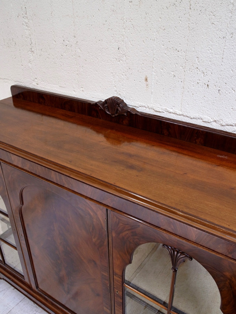 推定1920年代、イギリス製のアンティークウォルナットキャビネットです。重厚感のあるキャビネットで、アーチ型の扉が印象的で左右は側面もガラスがあるため飾ったものが映えます。ディスプレイと収納どちらもできて、リビングなどに置いてご使用いただくのがおすすめです。張地はオリジナルのままで所々にシミが見られますが張替も承れます(別途加工代がかかります)。扉内寸 左右W360 D340 H385/315mm。中央 W460 D340 H230/H225/H240mm。その他ショーケースはこちらから。