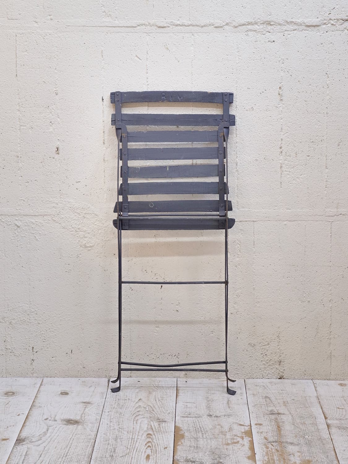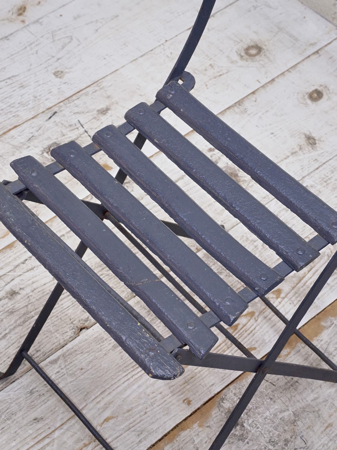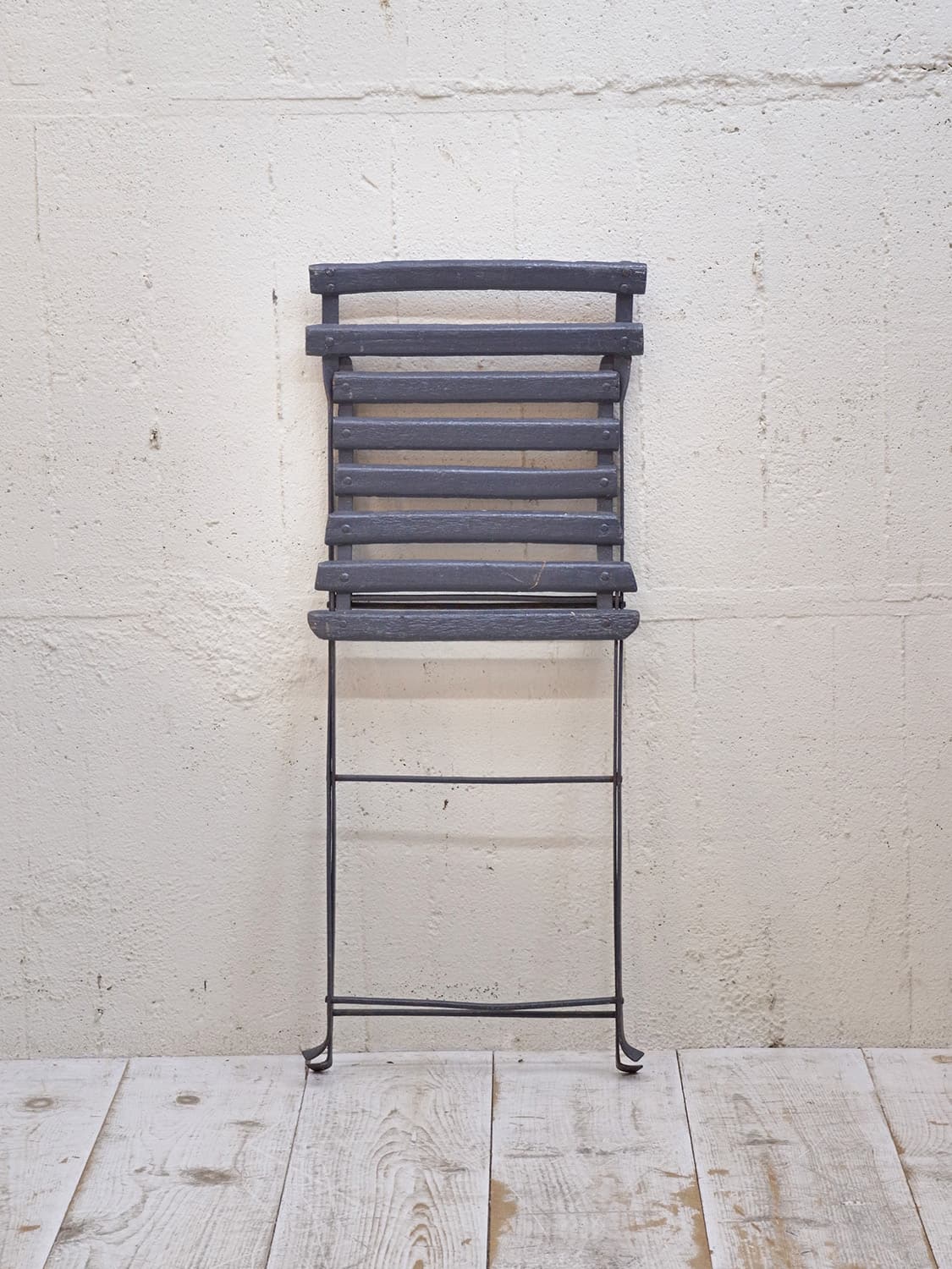 推定1950年代、フランス製のアンティークガーデンチェアです。折りたたんで収納できます。フランスのカフェなどに置いてあるのを見たことがある方も多いかもしれません。シックなダークブルーでペイントされて室内で使用していたのかペイントの剥がれもなくきれいです。背もたれの背面に英文字が入っているもの可愛らしいです。背もたれがたおれたデザインでゆったり座ることができます。その他のガーデンチェアはこちらから。