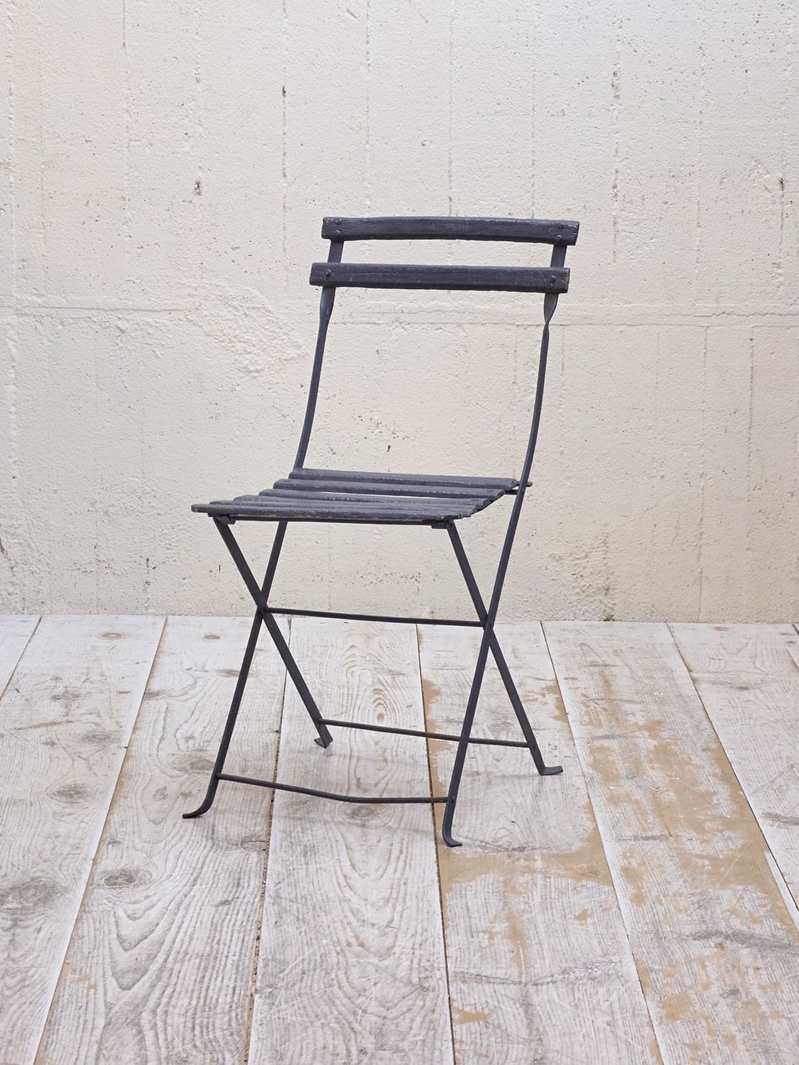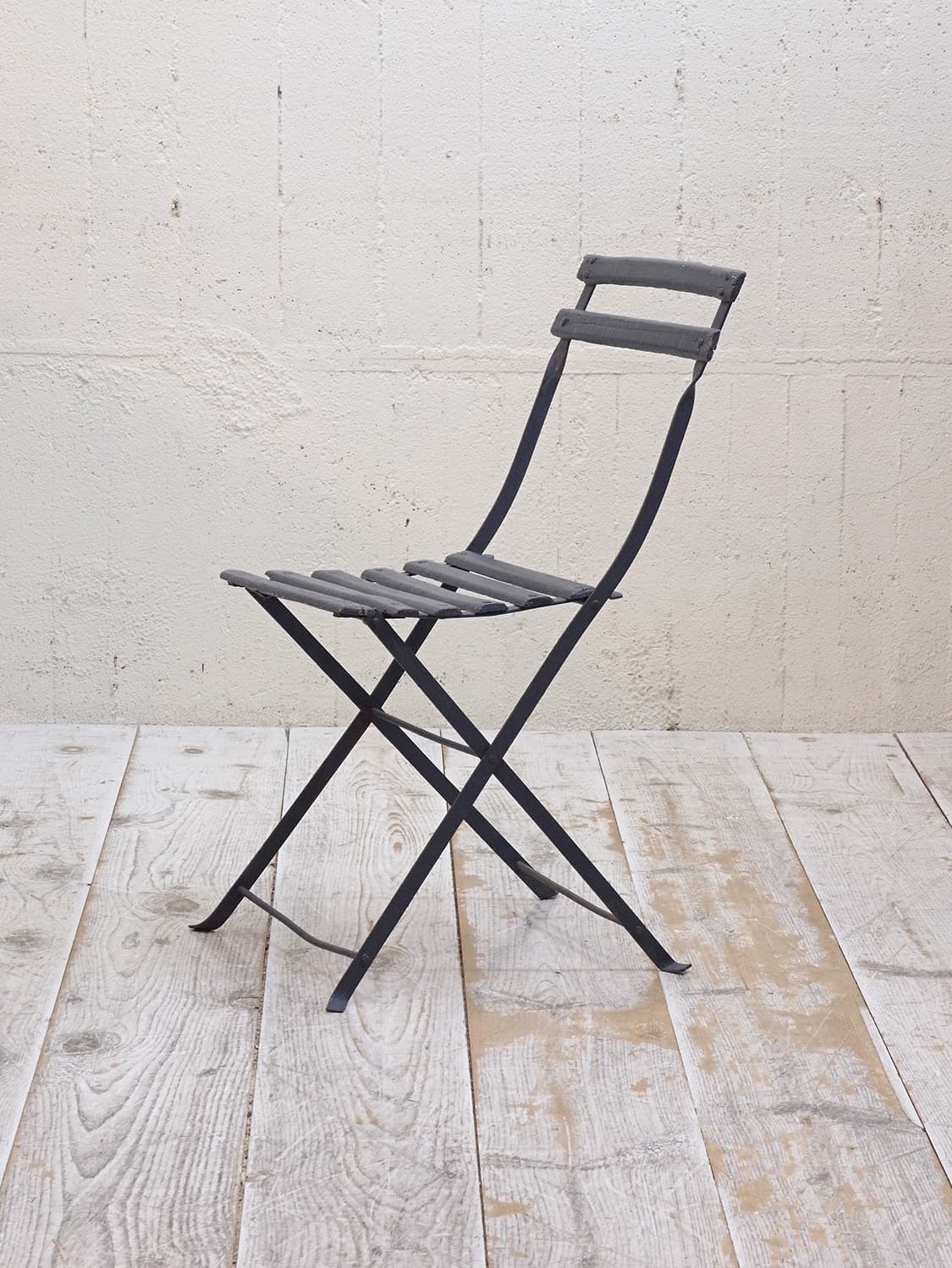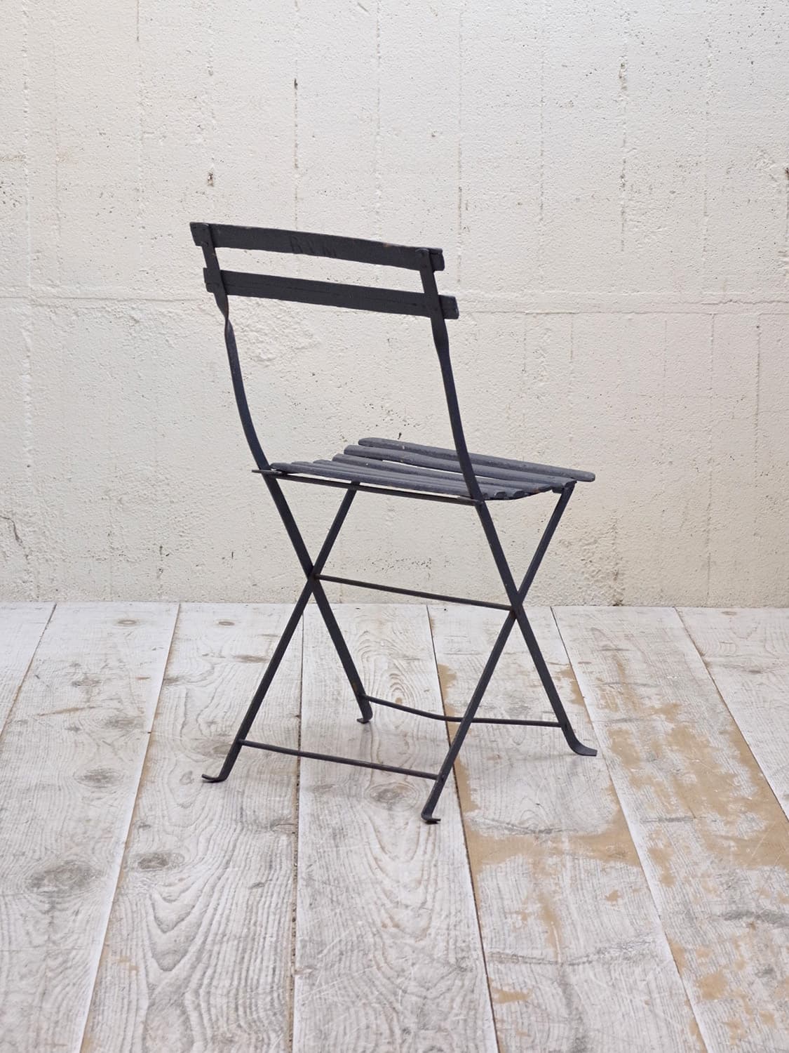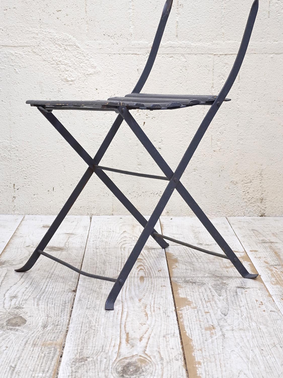 推定1950年代、フランス製のアンティークガーデンチェアです。折りたたんで収納できます。フランスのカフェなどに置いてあるのを見たことがある方も多いかもしれません。シックなダークブルーでペイントされて室内で使用していたのかペイントの剥がれもなくきれいです。背もたれの背面に英文字が入っているもの可愛らしいです。背もたれがたおれたデザインでゆったり座ることができます。その他のガーデンチェアはこちらから。