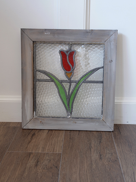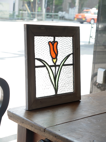 光の差し込みによって色が変わるステンドガラス。こちらは人気のお花模様です。ドアの建具に入れたり、窓辺にディスプレイしてご使用することをおすすめしています。