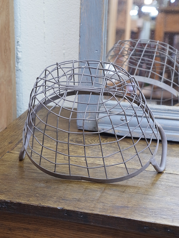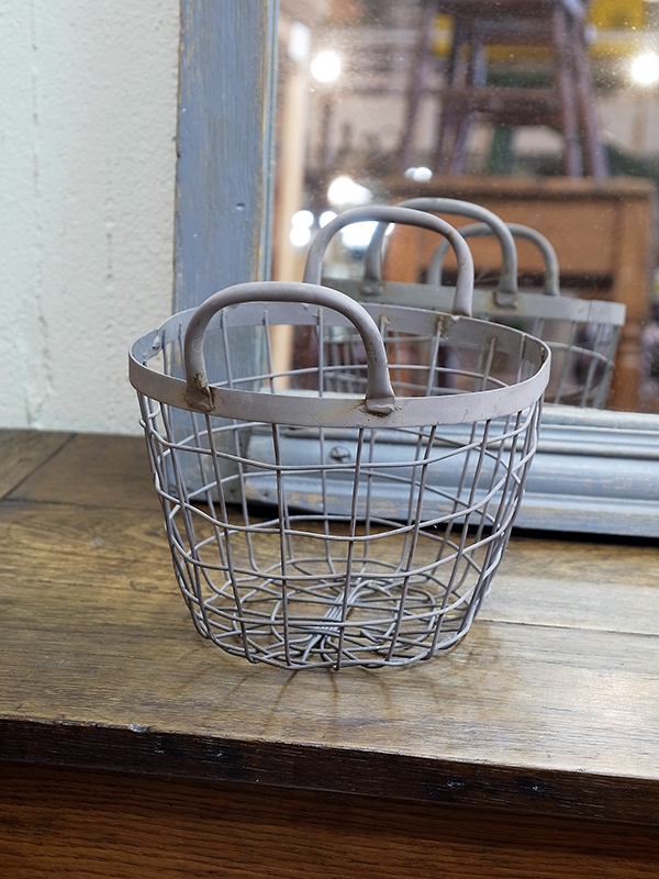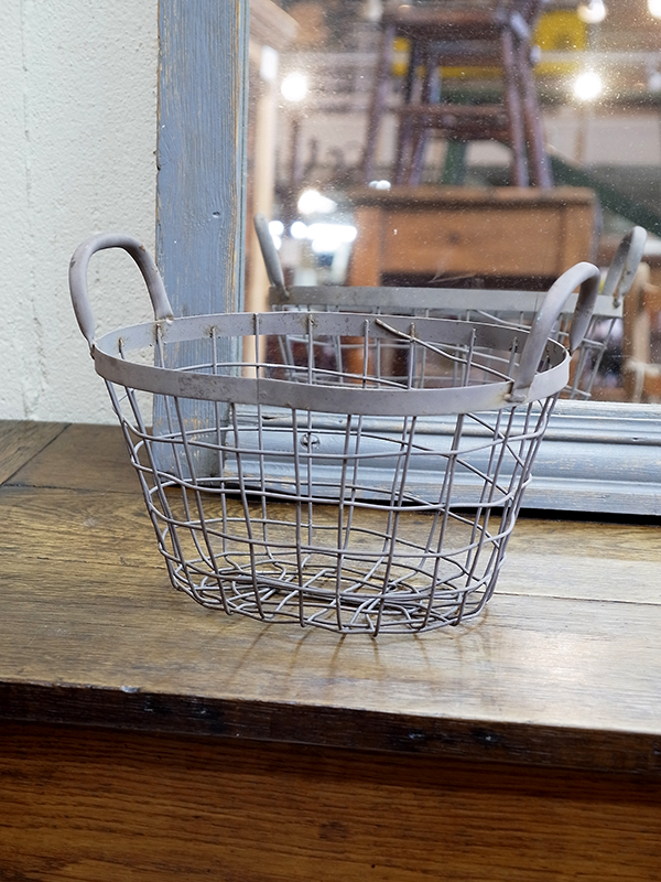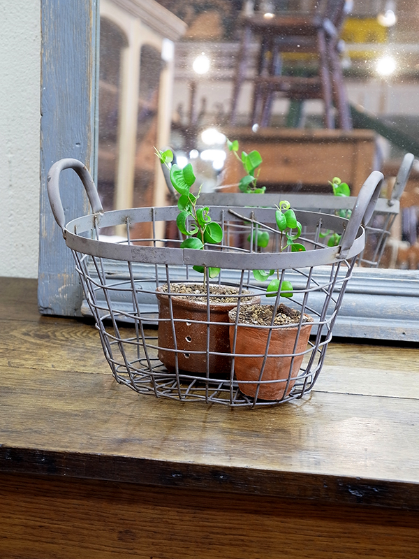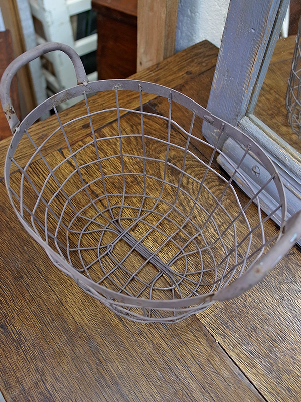 推定1930年代、イギリス製。 バスケット内寸 W280 D220 H155 経年変化によるワイヤーのゆがみやサビは見られます。キッチンではポテトや玉ねぎをストックしたり、お庭ではガーデニンググッズを入れたりと様々な用途に使えるアイテムです。