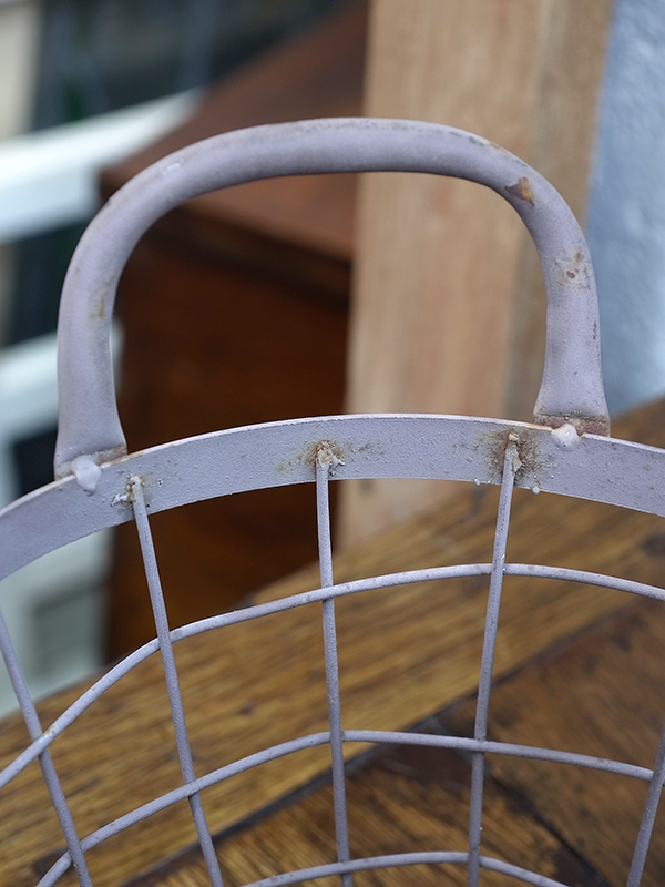 経年変化によるワイヤーのゆがみやサビは見られます。キッチンではポテトや玉ねぎをストックしたり、お庭ではガーデニンググッズを入れたりと様々な用途に使えるアイテムです。