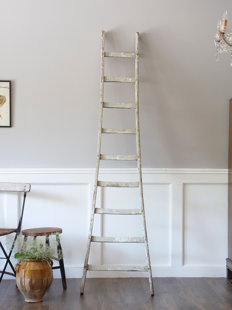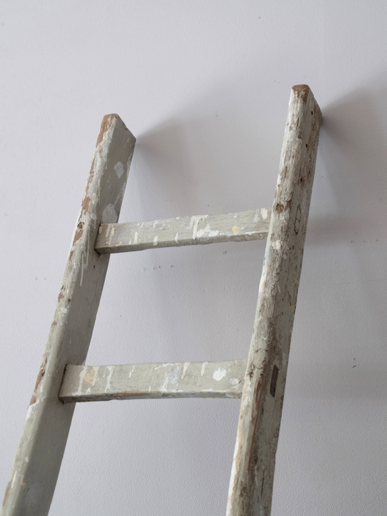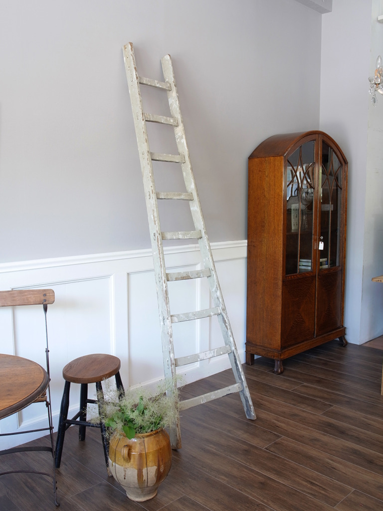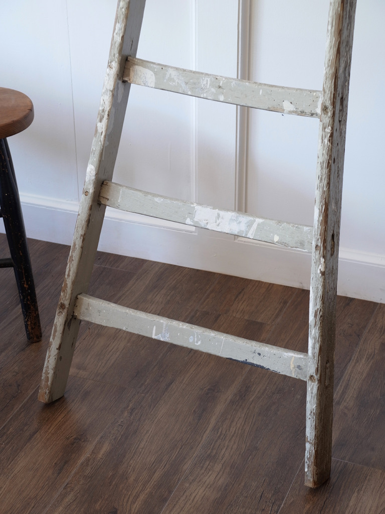 林檎の収穫用に使用されていた梯子です。繰り返し塗り直されたグレイッシュなペイントが程よく剥がれ、所々に木地が出ていて、とても味のある風合いをたのしめます。しっかりとした作りにはなっていますが、古いものですので、クロスを掛けたり、フックやハンガーなどを使用してディスプレイ用梯子としての使用をお勧めします。