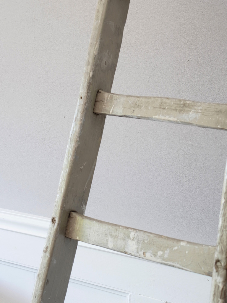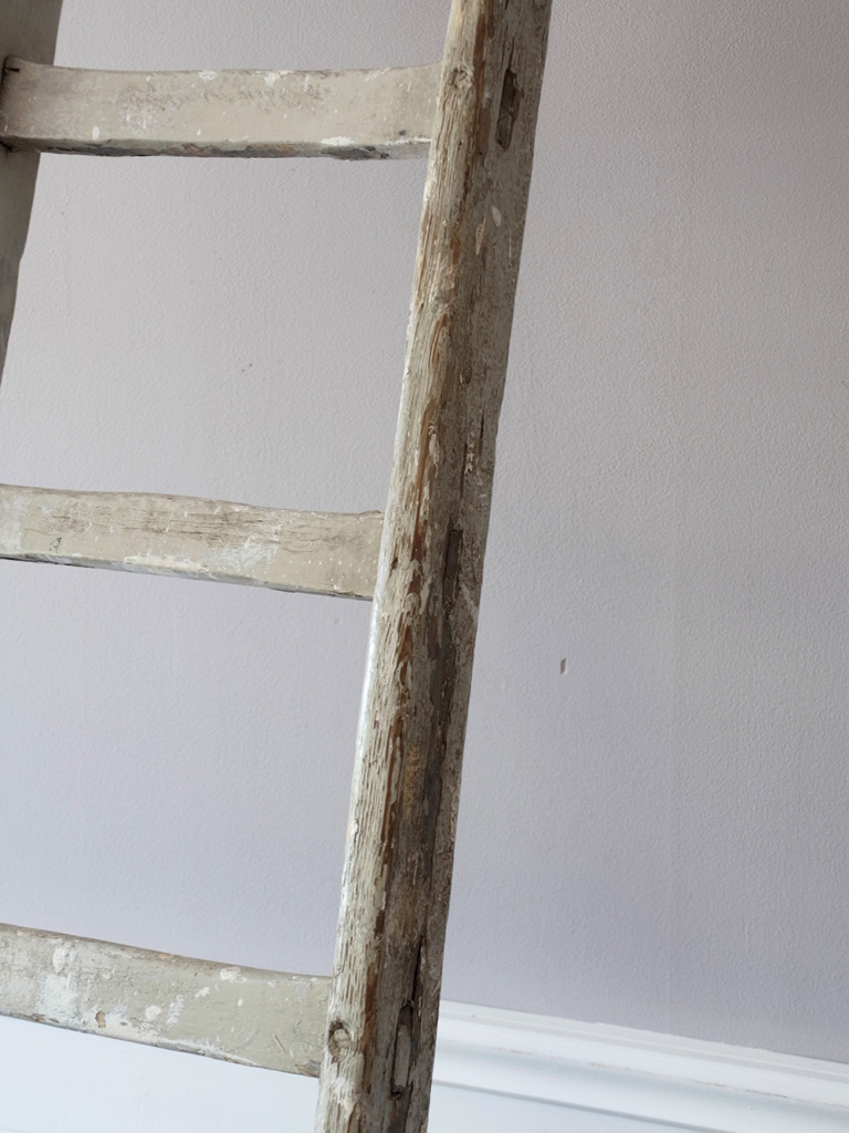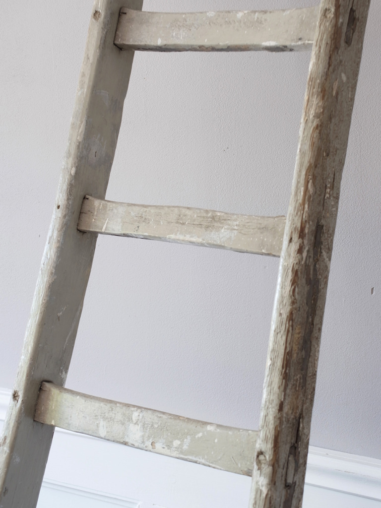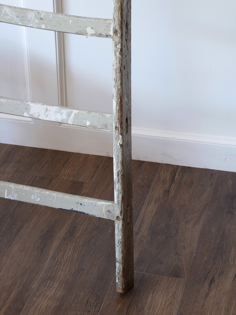 林檎の収穫用に使用されていた梯子です。繰り返し塗り直されたグレイッシュなペイントが程よく剥がれ、所々に木地が出ていて、とても味のある風合いをたのしめます。しっかりとした作りにはなっていますが、古いものですので、クロスを掛けたり、フックやハンガーなどを使用してディスプレイ用梯子としての使用をお勧めします。