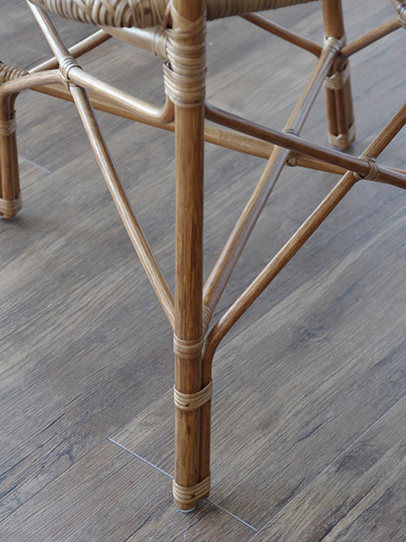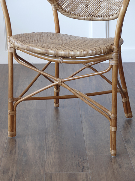 ラタン素材なので軽く、移動も楽です。同シリーズのアームなしチェアもあります。