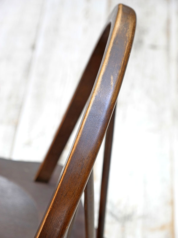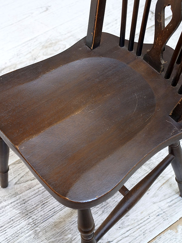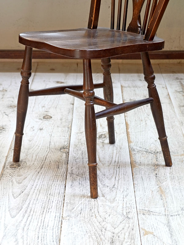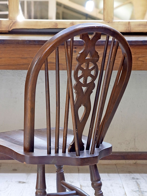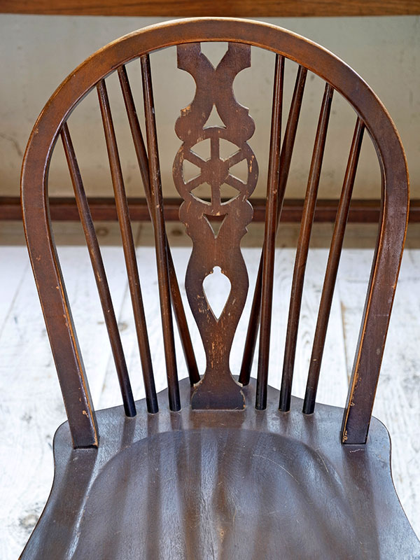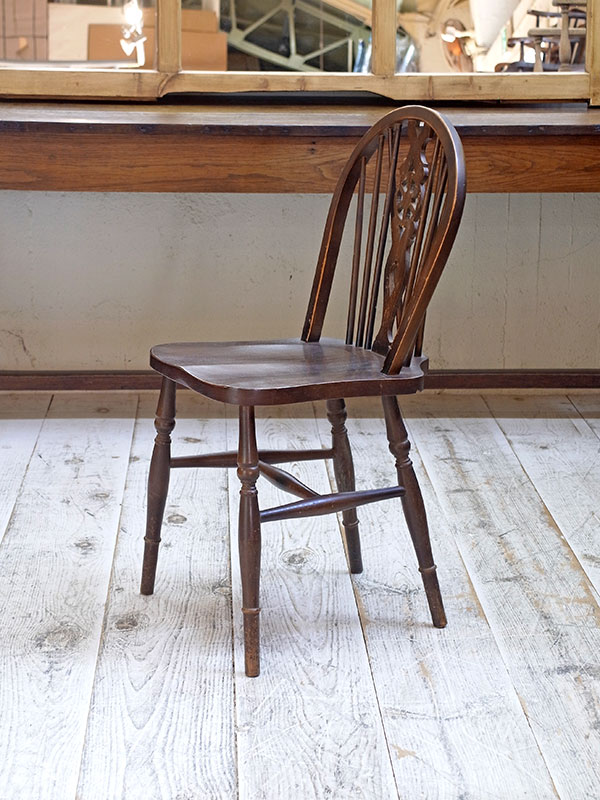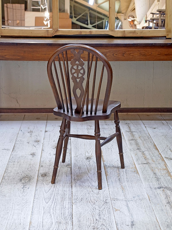 価格は1脚の値段です。 推定1930年代、イギリス製。座面までの高さは47㎝。 背もたれにホイール(車輪)がデザインされた、その名もホイールバックチェアです。すこしづつディティールが違うため、それぞれの表情が違い愛嬌のある椅子です。似たデザインの椅子はこちら。