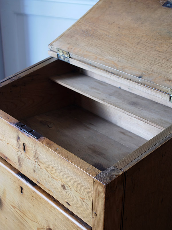 推定1930年代、イギリスアンティークオールドパインデスク&チェストです。 天板を開くと収納になっています。2段ある引き出しは深さや奥行があるので嵩張るものでも楽に入ります。小ぶりなので玄関先やリビング、書斎、ベッドルームなどアイデア次第でいかようにも使用できます。 引き出しの内寸W505 D370 H220〜240。