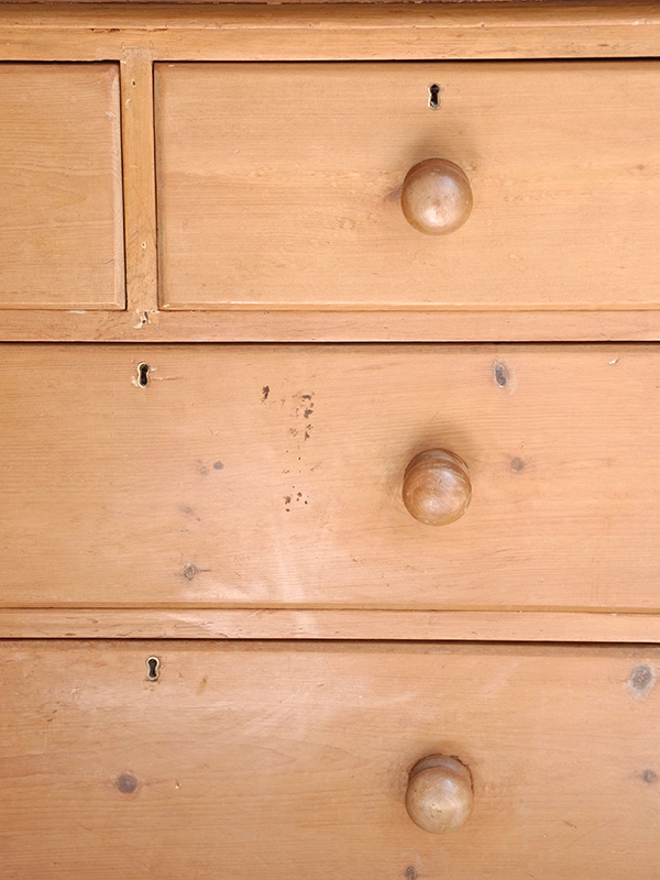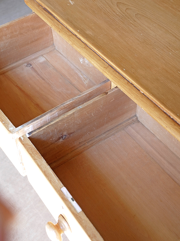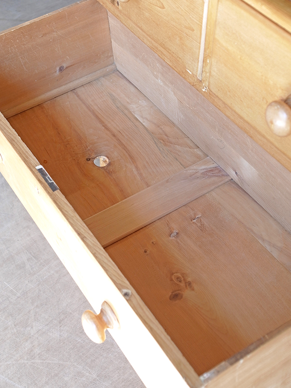 推定1930年代、イギリス製。 パイン材の木目がきれいなちょうどよいサイズ感のチェストです。 引き出し上段 W375 D330 H155ミリ ×2杯 引き出し中・下段 W795 D330 H185/H200ミリ