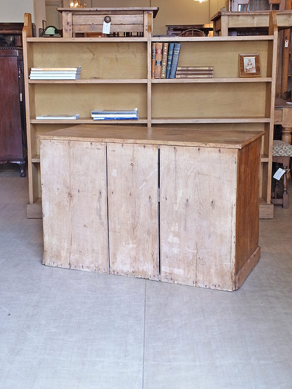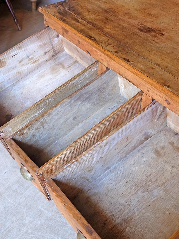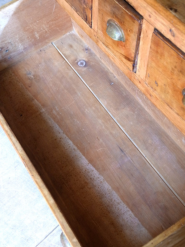 推定1920年代、イギリス製。 大きな引き出しが4杯も付いたアンティークパインチェストです。 存在感と大容量の収納力は店舗用什器としてもおすすめです。 引き出しの内寸 上段左右 W360 D495 H170ミリ 中央W180 D495 H160ミリ 下段 W1040 D460 H270ミリ