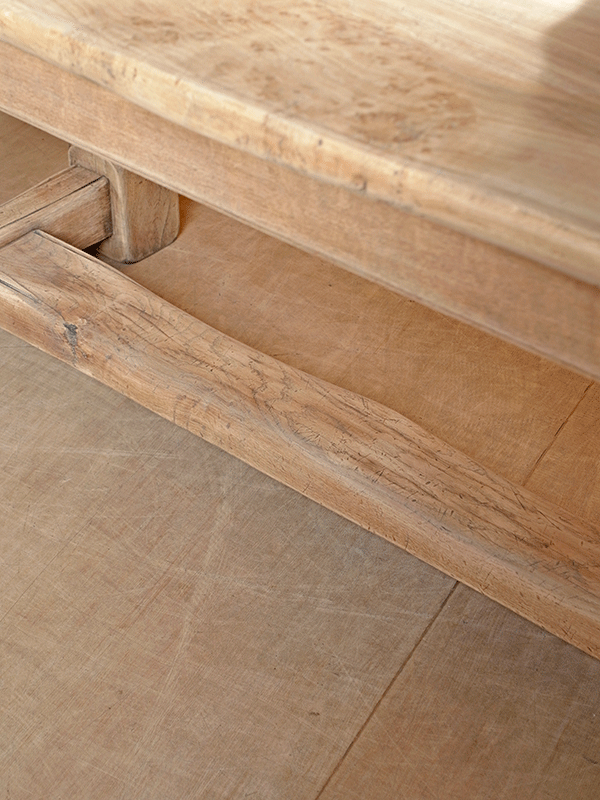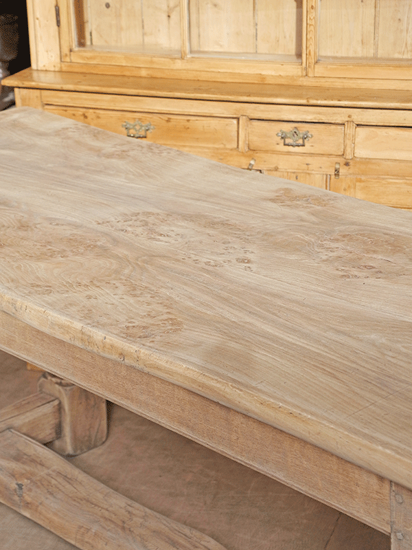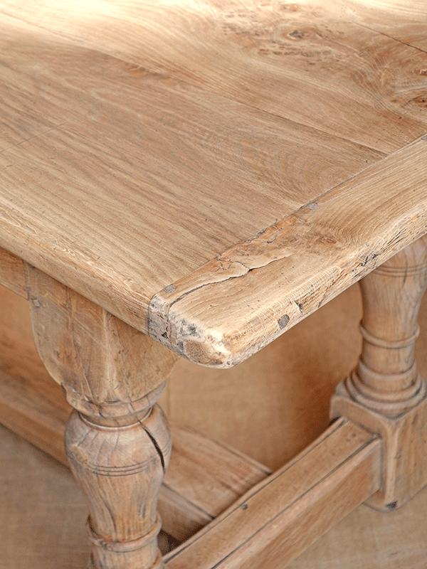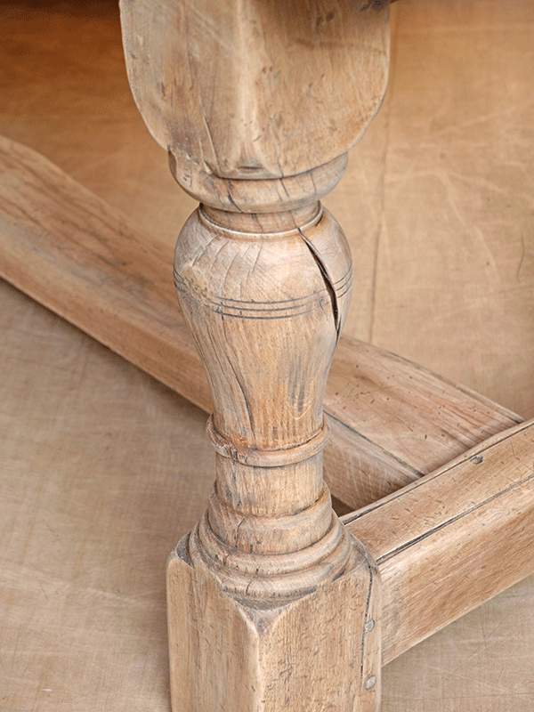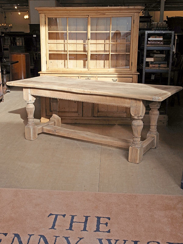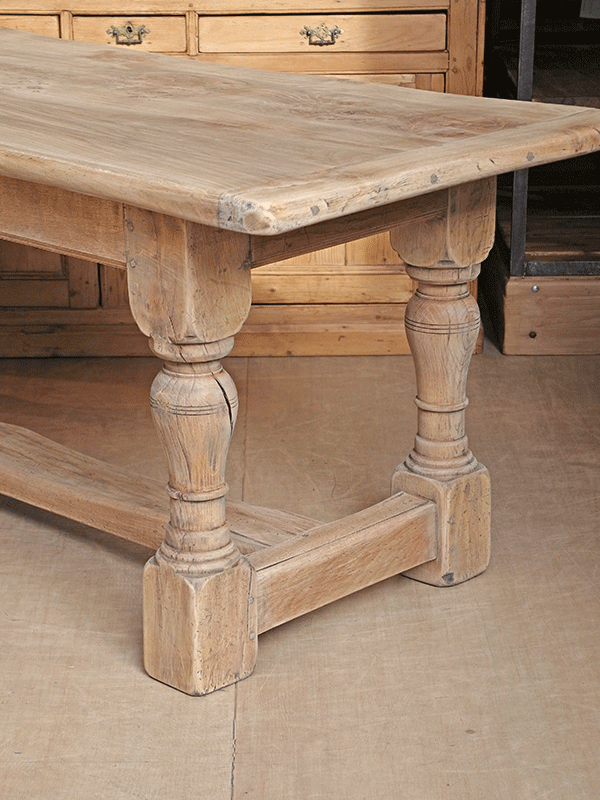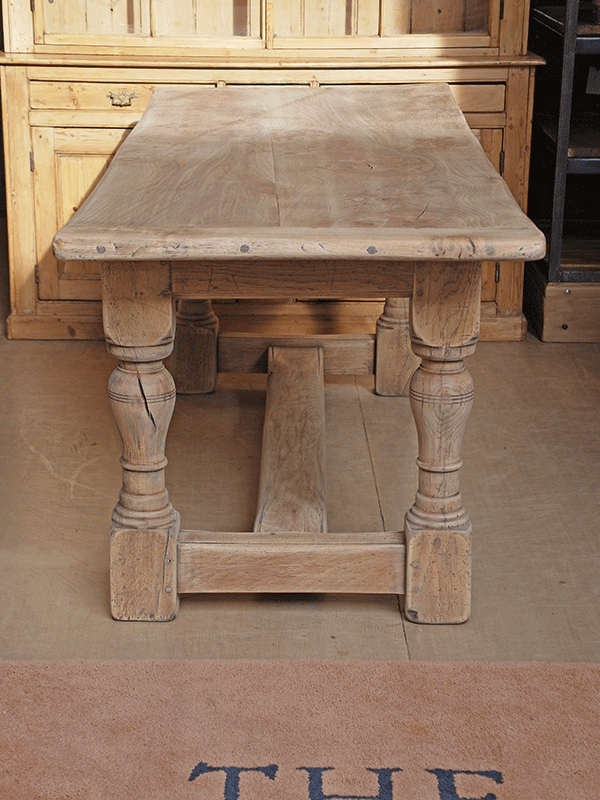 推定1900年代初頭、イギリス製。 イギリス製。もともとはダーク塗装だったものを剥離し、オーク材のきれいな木目を際立たせるようにしました。どっしりとした脚、5?という厚みのある天板、2mというサイズなので大迫力です。ダーク色の時は重厚感があり、正統派のアンティークでしたが、色が明るくなったことで現代のインテリアに取り入れやすい雰囲気になりました。