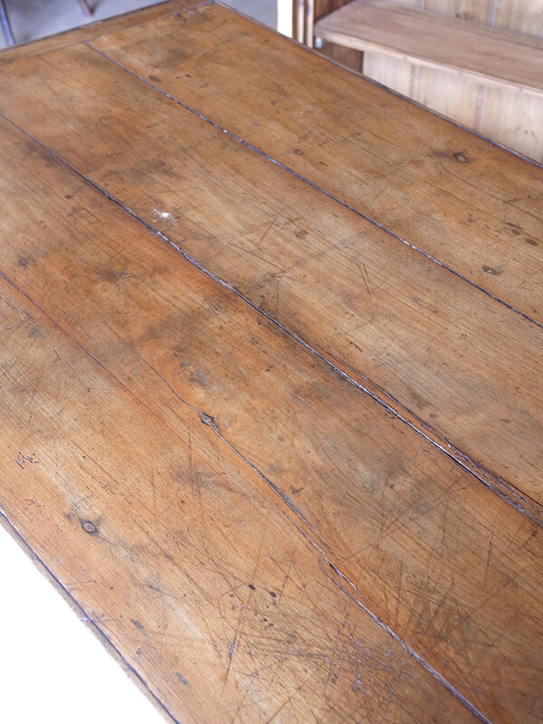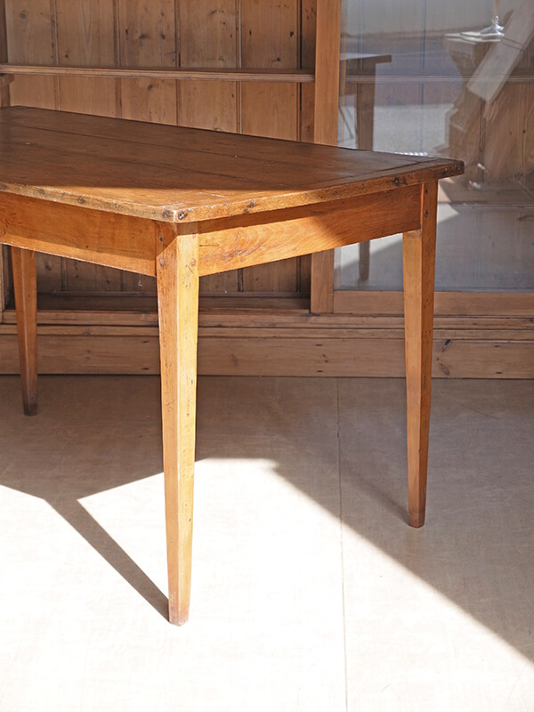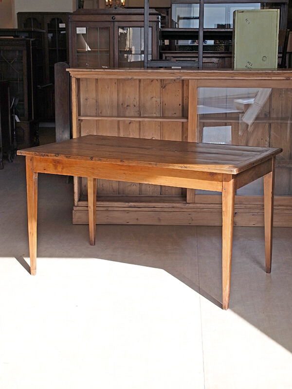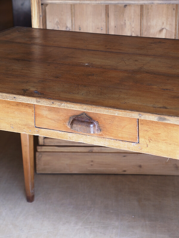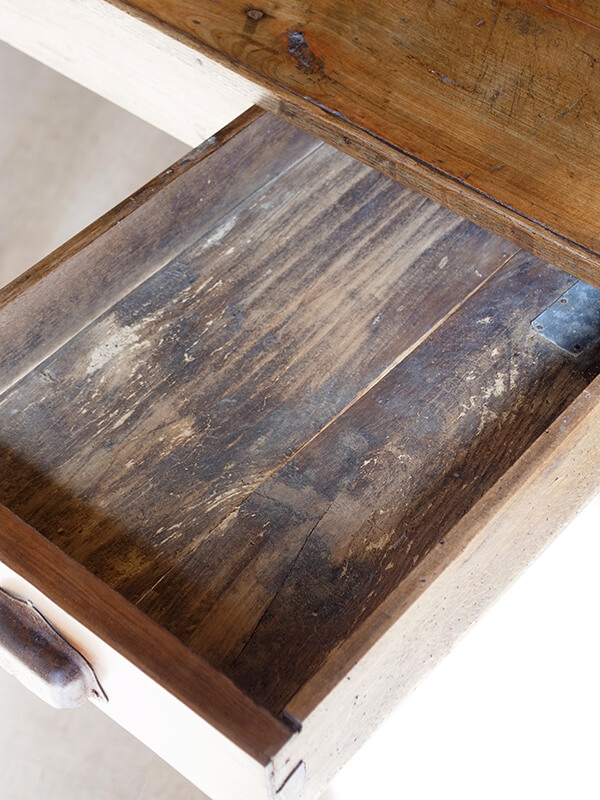 推定1920年代、フランス製。 引き出しの内寸 W275 D475 H55ミリ 華奢なストレートレッグが印象的なフレンチテーブルです。とても軽く移動も楽に行うことができます。ゆったり二人掛けのダイニングテーブルにも、作業台としてもご使用いただけます。