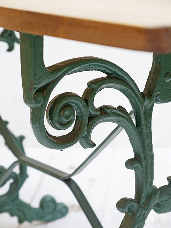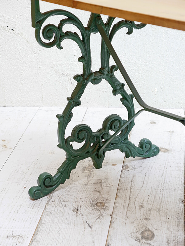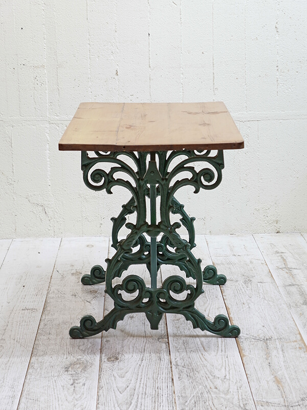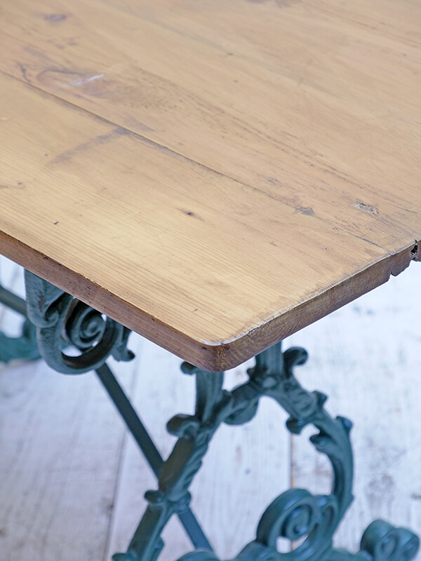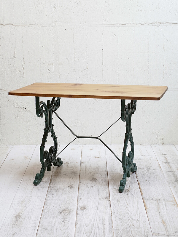 バラのツルのようなデザインのアイアンレッグにアンティークパインの天板の組み合わせが特徴的なガーデンテーブルです。