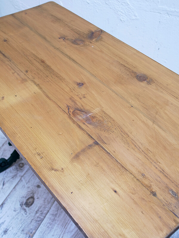 推定1930年代、イギリス製。 バラのツルのようなデザインのアイアンレッグにアンティークパインの天板の組み合わせが特徴的なガーデンテーブルです。 似たデザインのガーデンベンチもございます。
