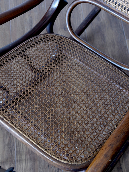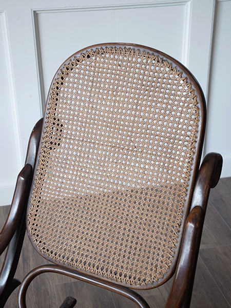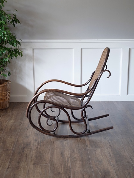推定1930年代、イギリス アンティーク ベントウッドロッキングチェアです。 大人気のベントウッドロッキングチェアが久しぶりの入荷です。ベントウッド(曲げ木製法)による曲線を活かしたデザインはどこから眺めても美しい佇まいです。籐編み座面もダメージがなく、状態は良好です。