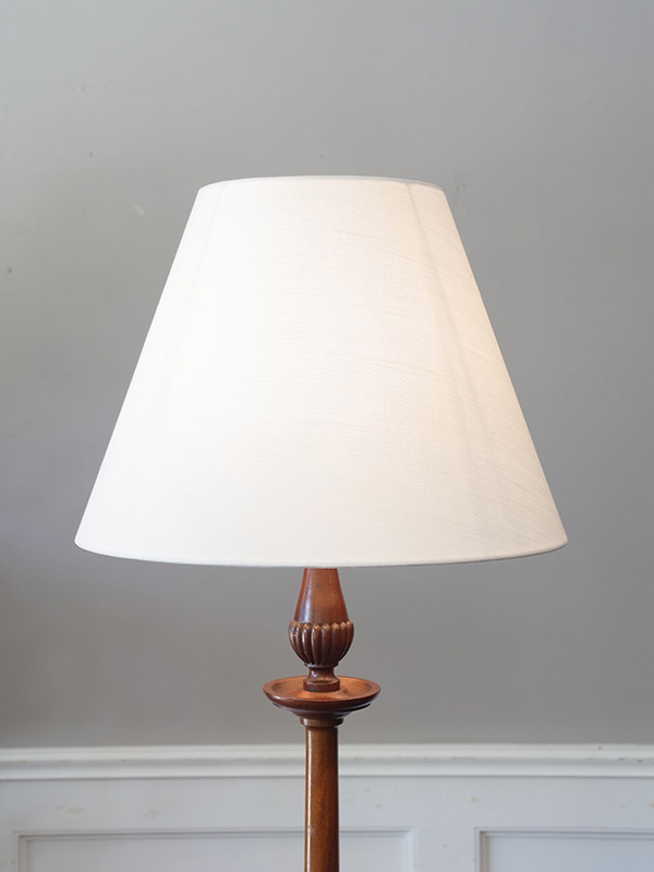 推定1930年代、イギリスアンティークマホガニーフロアランプです。シェードは弊社の生地部門コロニアルチェックのNatuurals 4を使用して仕上げています。電球取り付け部分にあるスイッチでON・OFFの切り替えが行えます。