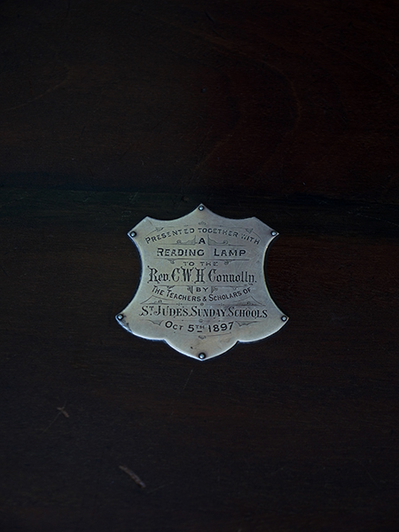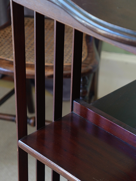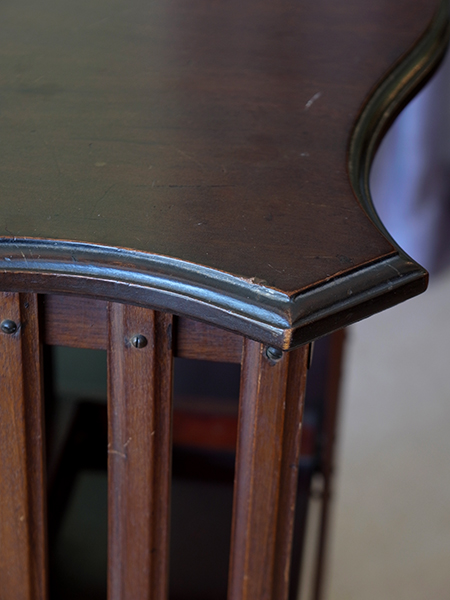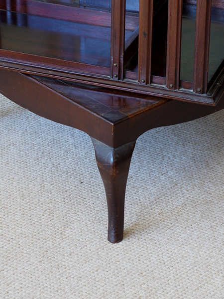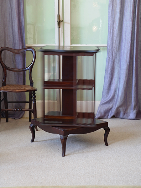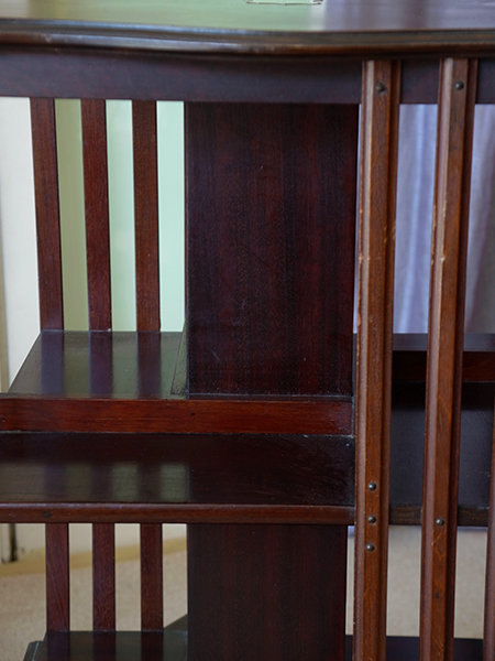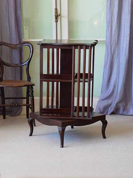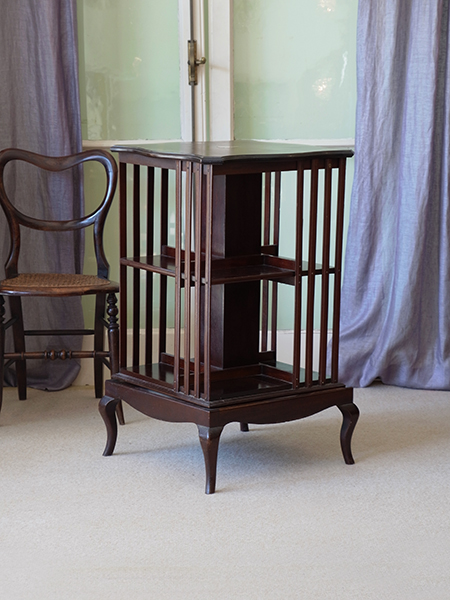 推定1890年代。イギリス製。回転式のブックケースは久しぶりの入荷です。贈り物として製作されたことを示す記念プレートが付いています。当時の本のサイズに合わせて、幅260mm奥行140mm高さ260mmに仕切られた書棚が8か所あります。クルクルと回る書棚は読みたい本をすぐに見つけることができるので便利です。