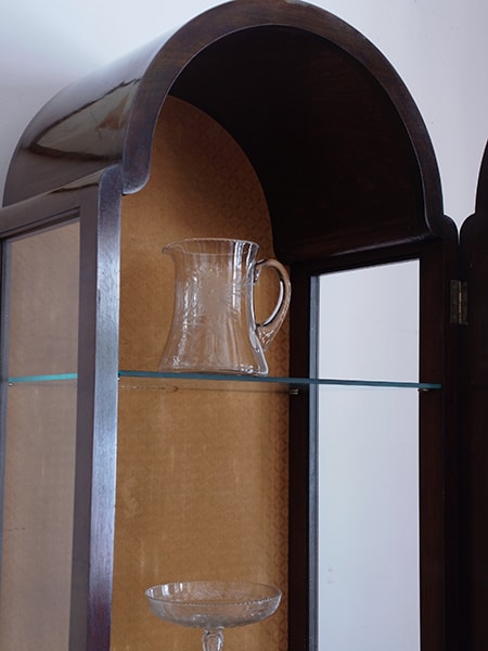 推定1920年代、イギリスアンティークアールデコショーケースです。独特な形のこのショーケースはとても目を引きます。 ガラスのショーケースは飾り棚として中に飾るものを引き立ててくれます。再度の木扉はそれぞれ棚板が付いていてこまごましたもののが見えず収納できるのでおススメです(棚板固定・好きな位置に取り付け可能)。