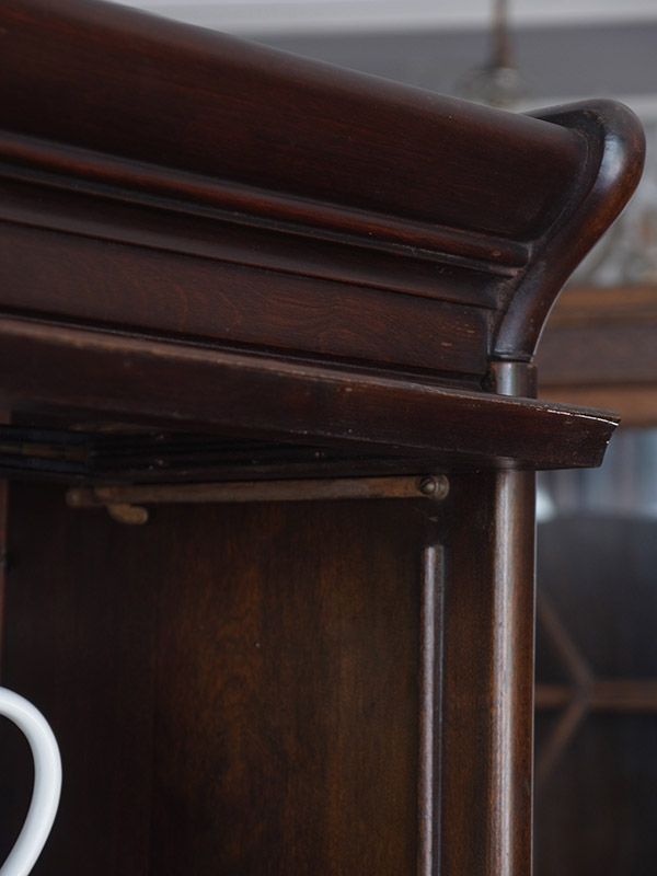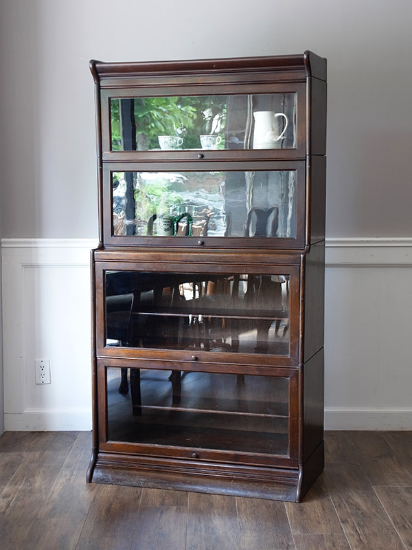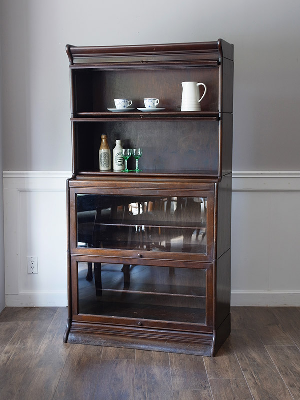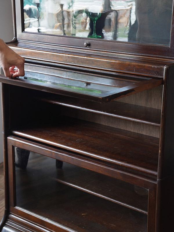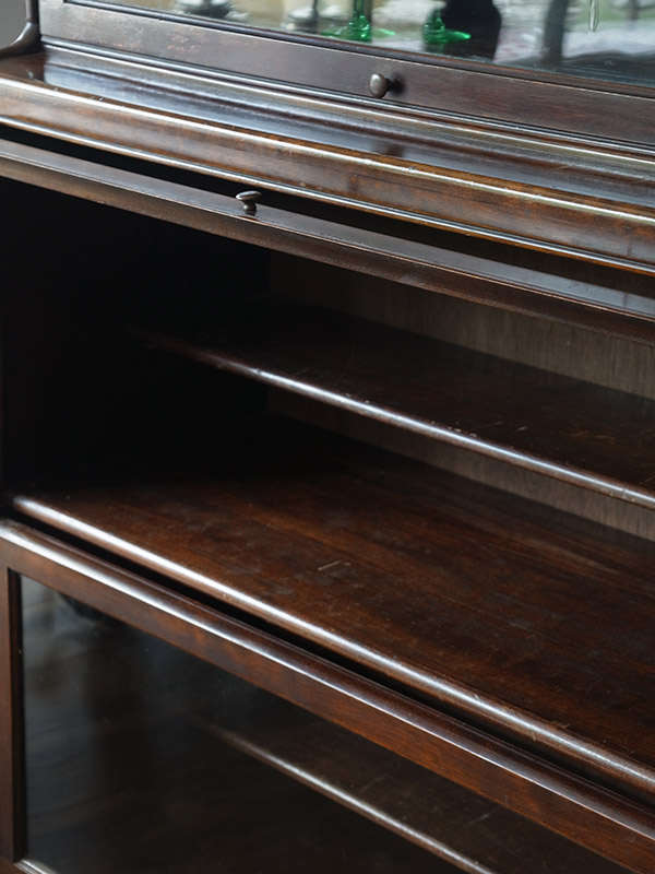 推定1930年代、イギリス アンティーク マホガニースタッキングブックケース。 スタッキングタイプのブックケースは箱状の棚を積み重ねたもの。 シンプルなデザインなのでグラスやお皿など食器をしまうキャビネットとしてもお薦めです。 手前にスライドさせてから内部に収まる扉なのでオープン棚のように飾ることも出来て出し入れもしやすいのが特徴です。 棚の内寸は上台の2段W820 D225 H225、下台の2段がW820 D340 H340です。 使い勝手を考えて4段で撮影しましたが、実は上台には更に一段W820 D255 H380サイズの棚をスタッキングして5段にすることも可能です。