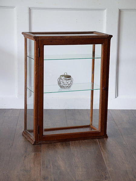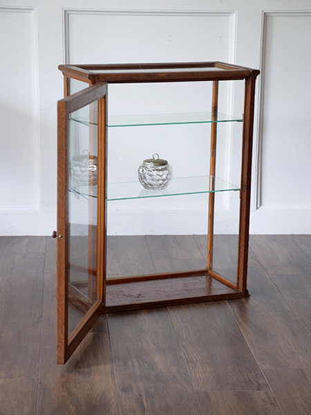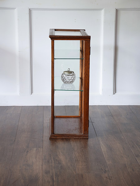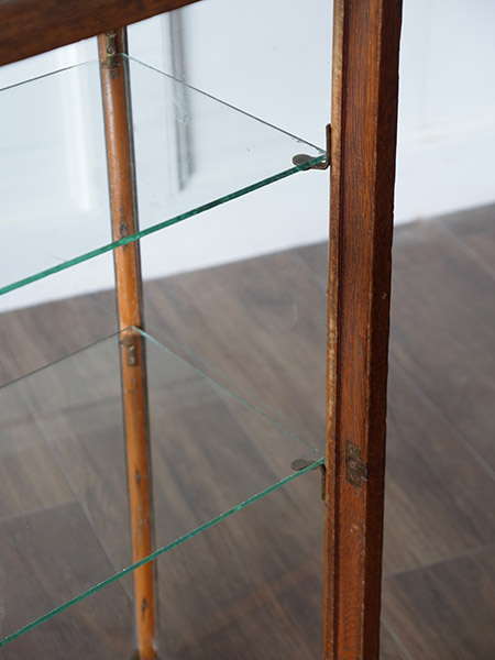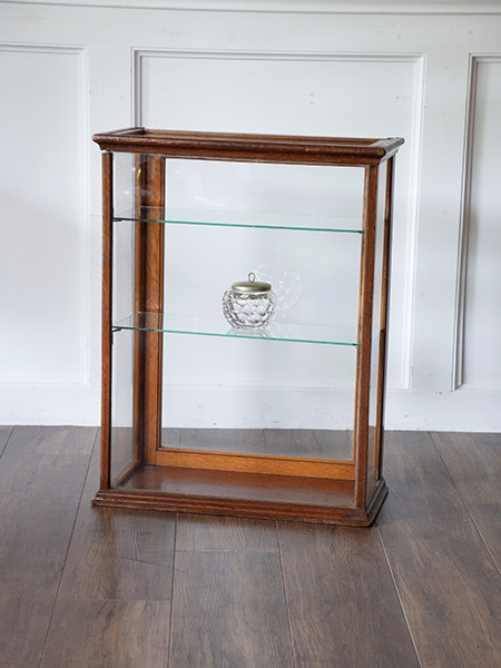 推定1930年代、イギリスアンティークオークショーケースです。内部寸法はW480 D200 1段目高さ130 2段目200 3段目300です。キッチンカウンターなどにガラス小物をディスプレイ収納に適しています。個人の趣味の飾り棚としても活躍してくれそうです。