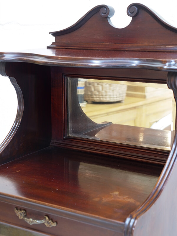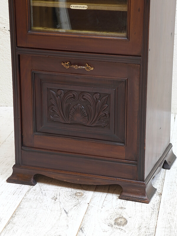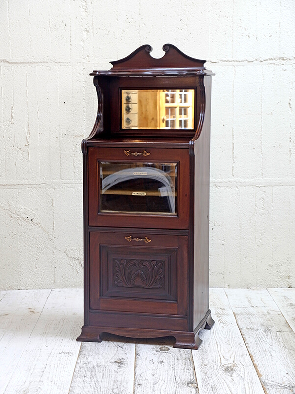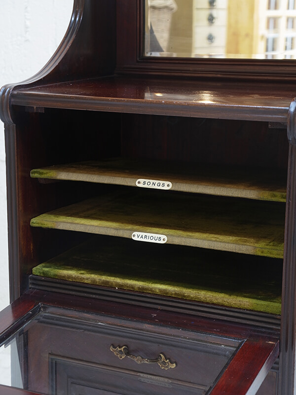 推定1920年代、イギリス製。 天板までH1100ミリ ミラーバックの棚までH820ミリ ガラス扉が付いている部分にはレコードを収納できます。(W410xD330ミリ ) 木扉は仕切りのあるラックが出てくるので楽譜などを収納することができます。(W380xD270ミリ) 上質なマホガニーカラーが部屋の雰囲気をワンランクあげてくれること間違いなし!のミュージックキャビネットです。