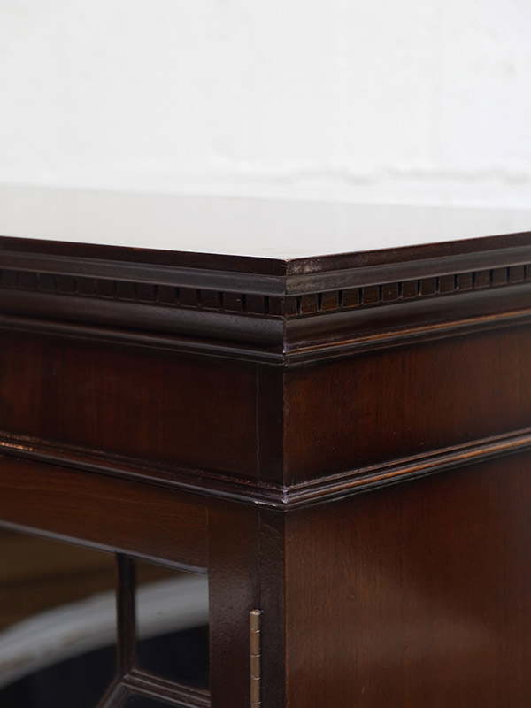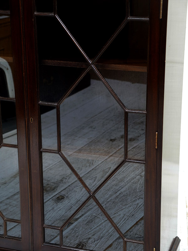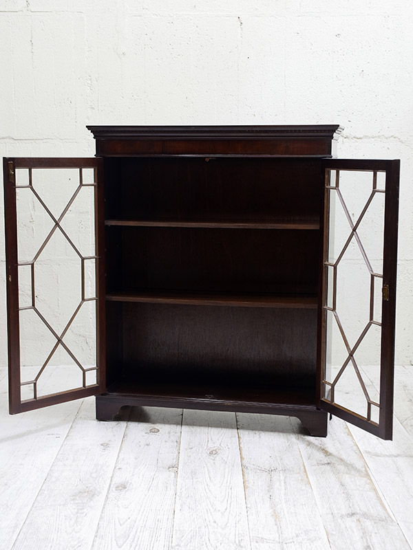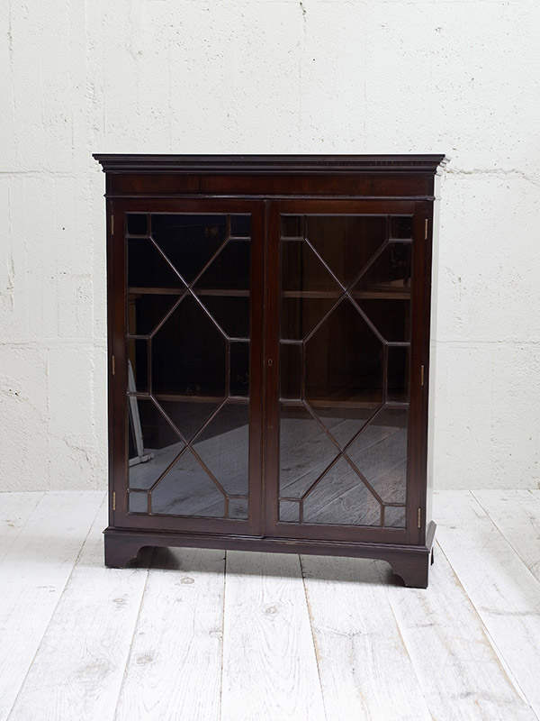 推定1920年代、イギリス製。アールデコスタイルのガラス扉のデザインが特徴的で人気があります。本の収納はもちろんですが、お皿などの収納棚としてもご使用いただけます。