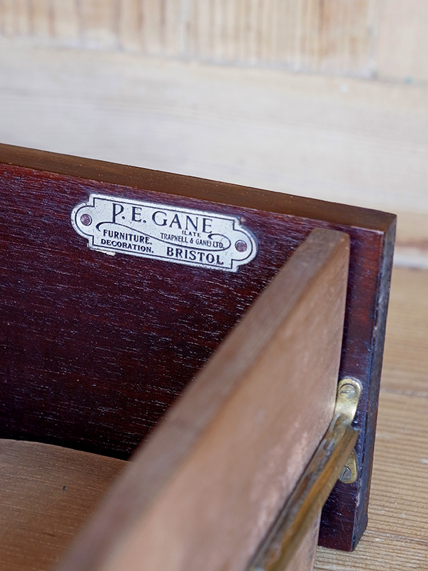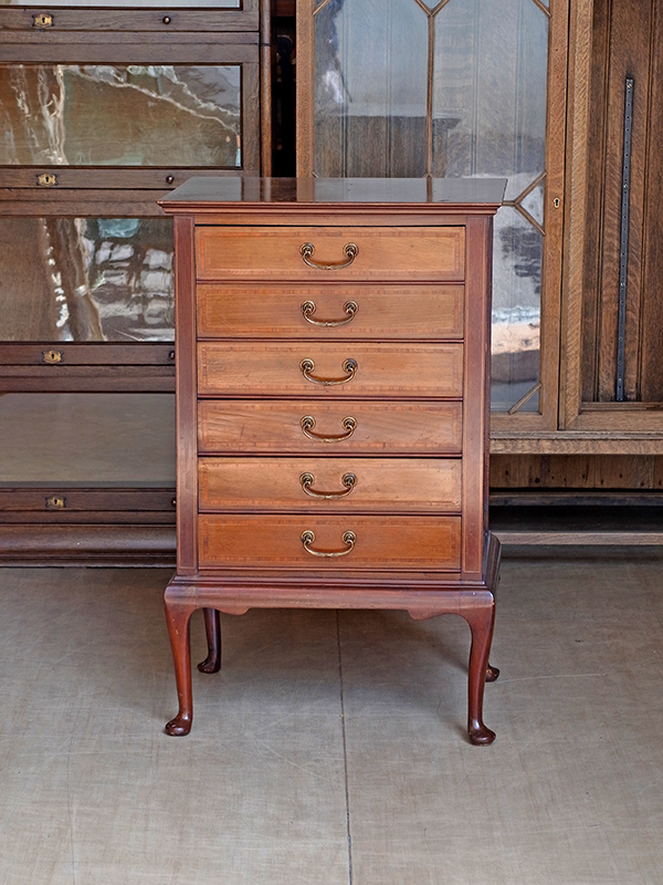 推定1920年代、イギリスP.E GANE Ltd製のミュージックキャビネットです。 引き出し内寸 W380 D275 H72×6 ミュージックキャビネットは譜面をファイリングするために作られた特殊な家具で、通常の抽斗とは作りが違い、前板がストンと手前に開くようになっています。上質なマホガニー材で作られており、裏面もパネル仕上げなので壁付けでなくても置くことが可能です。