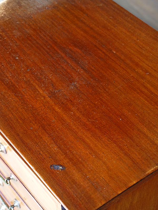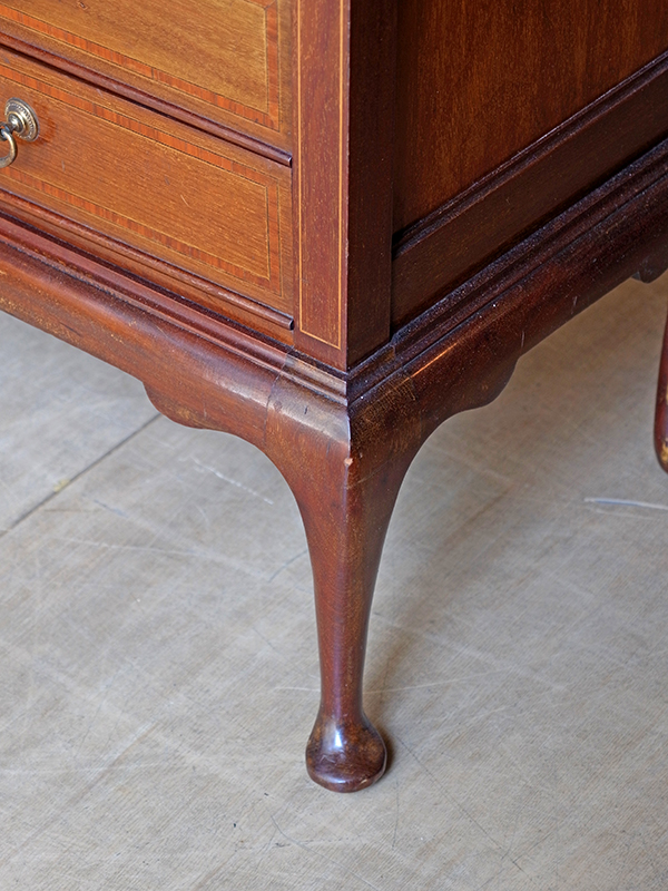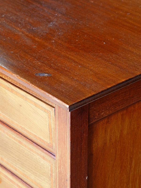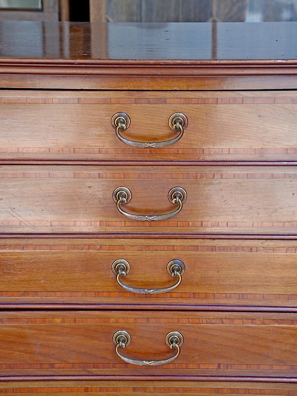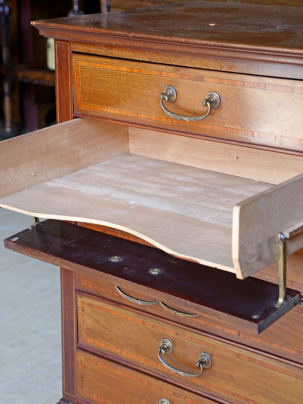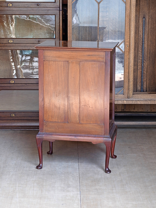 ミュージックキャビネットは譜面をファイリングするために作られた特殊な家具で、通常の抽斗とは作りが違い、前板がストンと手前に開くようになっています。上質なマホガニー材で作られており、裏面もパネル仕上げなので壁付けでなくても置くことが可能です。