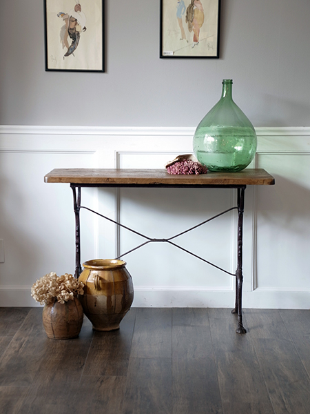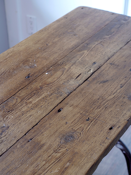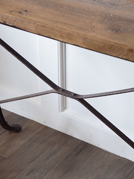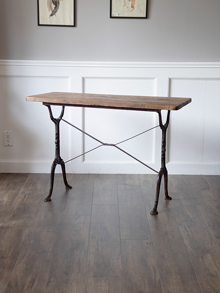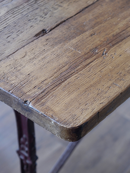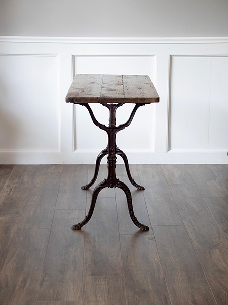 アイアン脚のビストロテーブルです。味のある天板と華奢なのにアイアン素材でしっかりした脚で、作業台にもまたはデスクとしてもご使用いただけます。