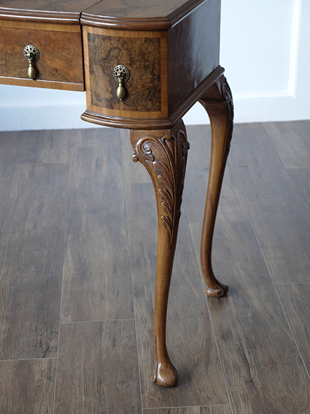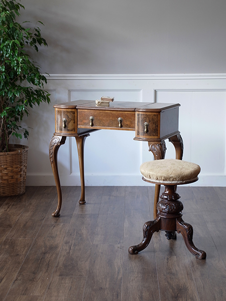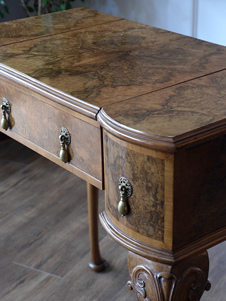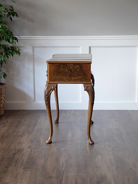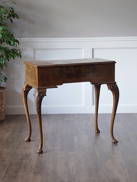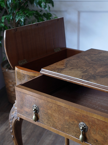推定1940年代、イギリス アンティーク ウォルナットサイドテーブルです。 上質なウォルナットの木目が美しい優雅なシルエットです。 中央は引き出し、左右は天板部分が蓋のように開いて深さのある収納スペースになっています。左右収納部分の内側のサイズは各W125 D 355 H165もありますので、見た目よりも収納力があります。センターの引き出し部分の内寸はW390 D320 H100です。玄関先などお客様をお迎えする場所や、リビングでのちょっとしたデスクとしても最適です。