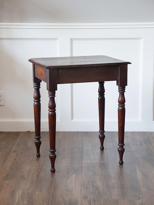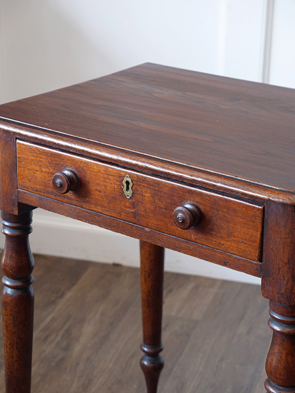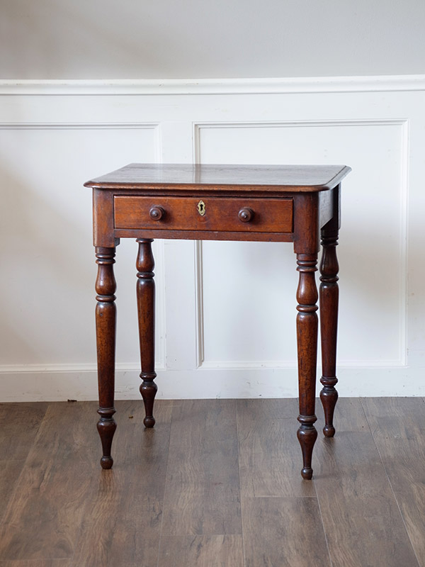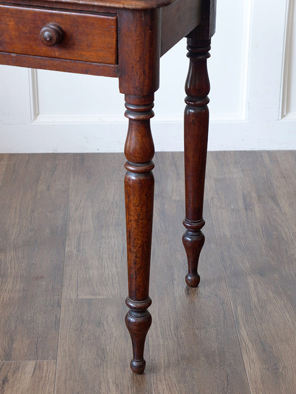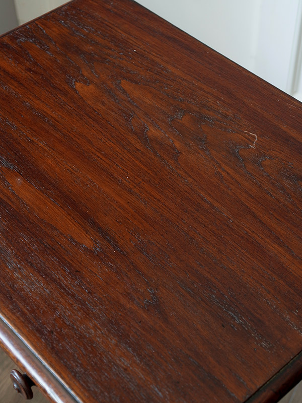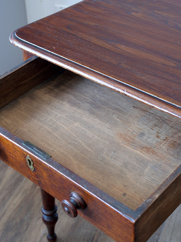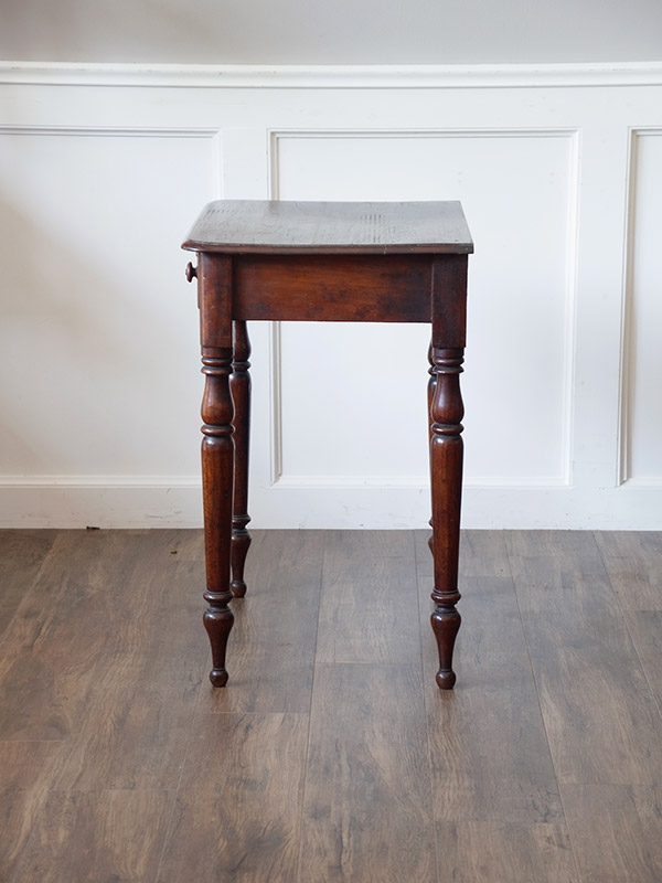 推定1920年代、イギリスアンティークマホガニーサイドテーブルです。壁面にピッタリくっつけることが出来るので、花台などのコンソールテーブルとしてもご使用いただけます。引き出しの内寸 W410 D330 H70です。