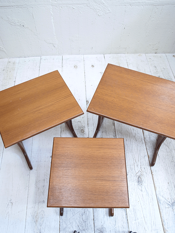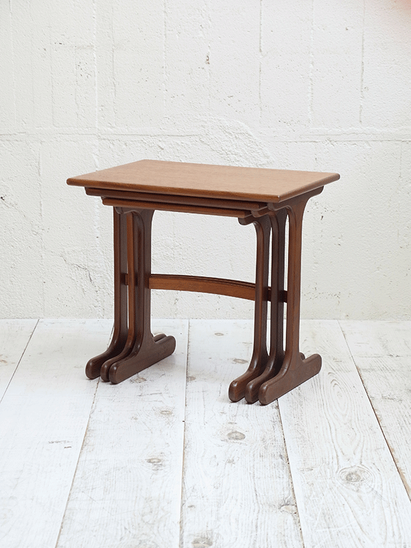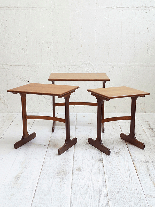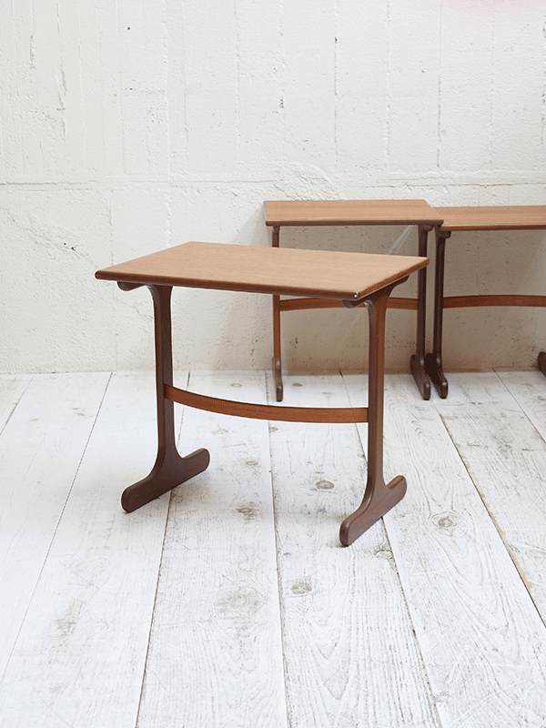 推定1960年代、イギリスG-planネストテーブルです。G-planはスカンジナビアン・デザイン(北欧のスタイル)の影響を色濃く受けたの家具ブランドです。シンプルなデザインでどんなお部屋にも合わせやすいです。大きな傷が無く、状態も良好です。 大W560 D410 H520 中W460 D380 H495 小W380 D360 H475