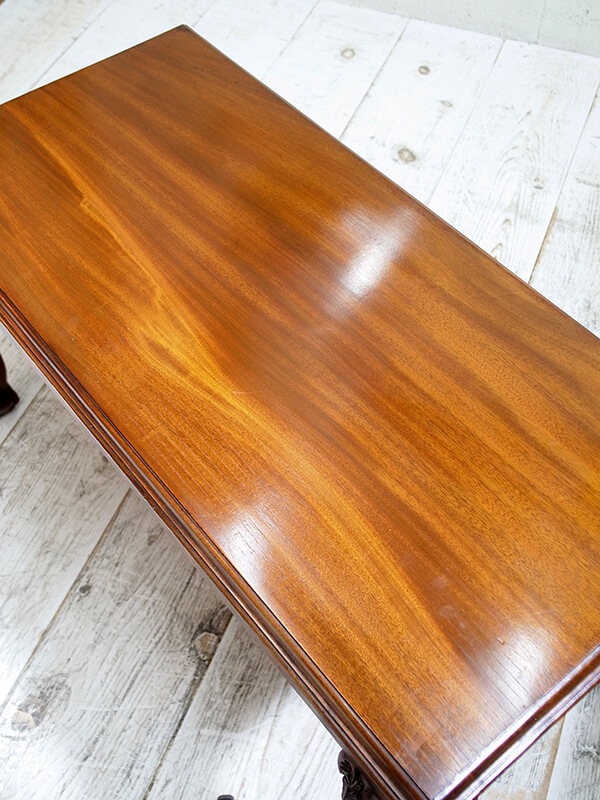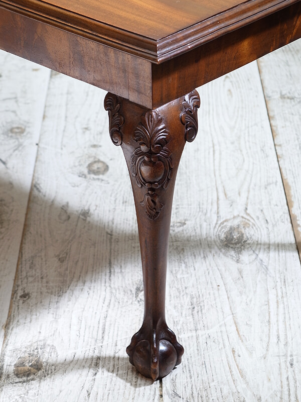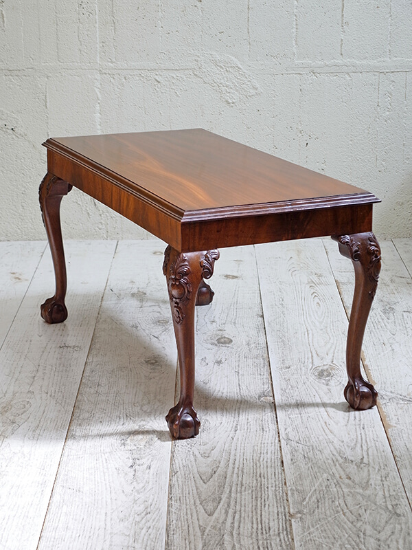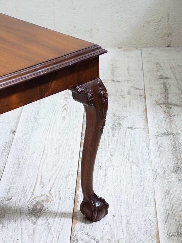 推定1920年代、イギリス製。 マホガニーのきれいな木目が印象的なコーヒーテーブルです。 脚には繊細な彫刻も施されています。