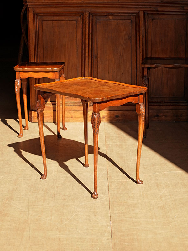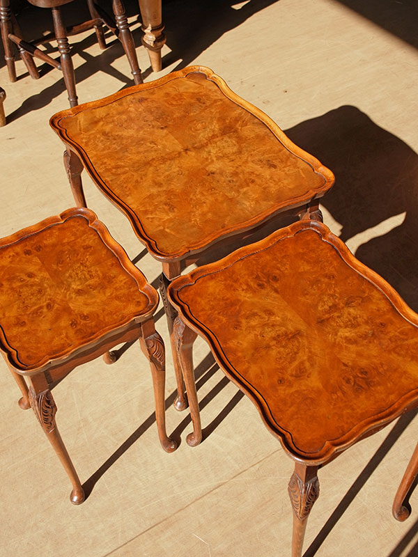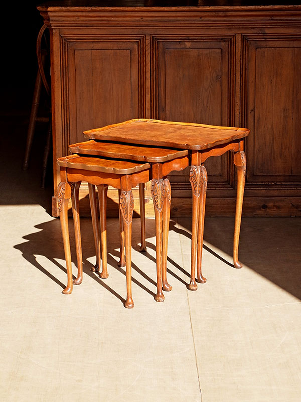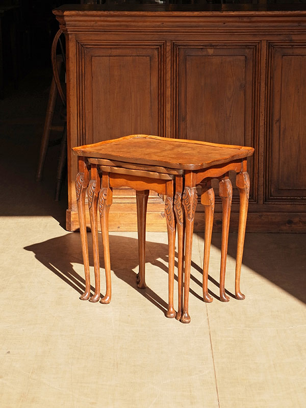 推定1930年代、イギリスアンティークウォルナットネストテーブルです。来客時はテーブルを増やすこともでき、重宝します。シンプルなデザインなので置く場所を選ばず様々な場所でご使用いただけます。
