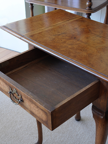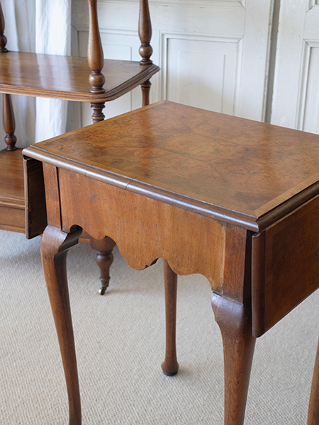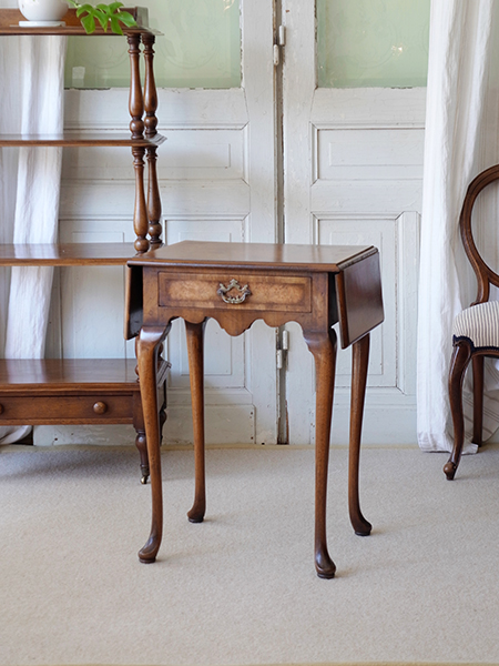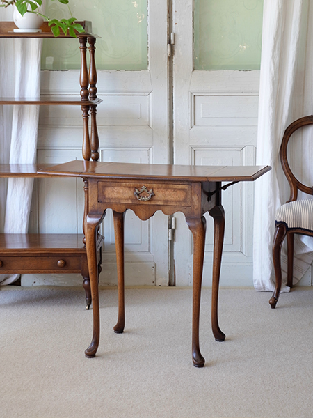 推定1900年代初頭。 左右に跳ね上げ式金具のバタフライ天板があります。しまう時は 手動でたたみます。優雅な曲線の脚が魅力です。 背景の家具: KQ235 ? マホガニーダムウェイター ? ? ? ? ? ? ? ? ? ??NE135 マホガニー バルーンバックチェア