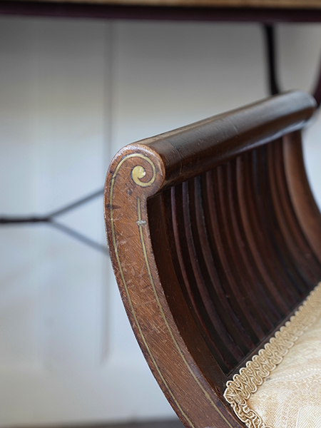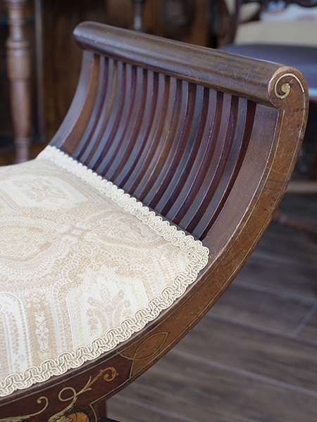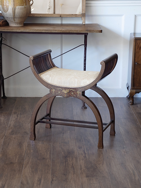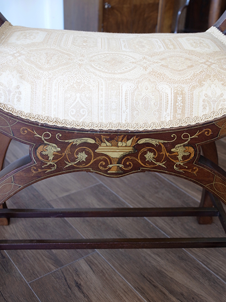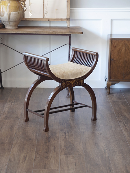 推定1920年代、イギリスアンティークマホガニースツールです。張地はオリジナルのままです。独特のフォルムが特徴的なスツールです。インレイ(象嵌)も正面・裏面共に施されています。
