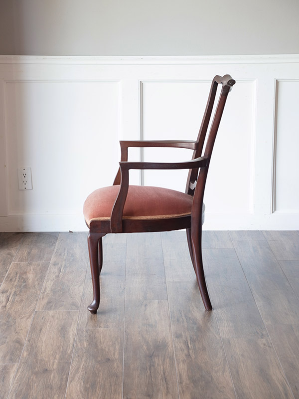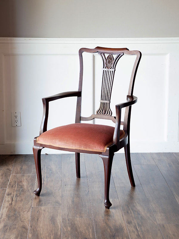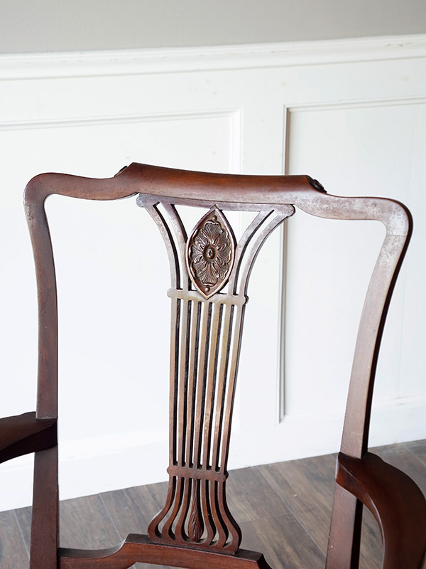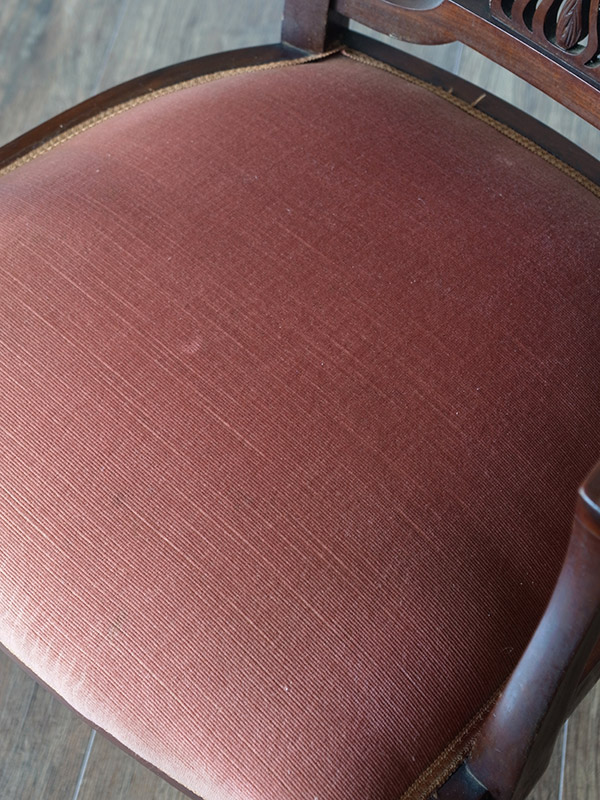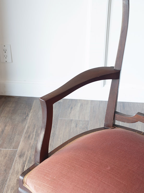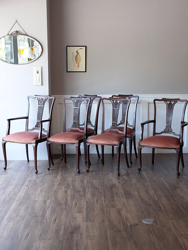 推定1930年代、イギリスアンティークマホガニーダイニングチェアです。アームチェアと合わせて6脚セットで入荷しました。座面はオリジナルのままですが、ダメージがある部分があります。張替加工代(¥12,000〜+生地代)別途必要。アームなしチェアはこちらから。