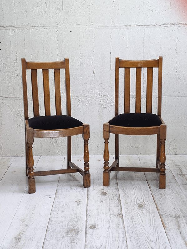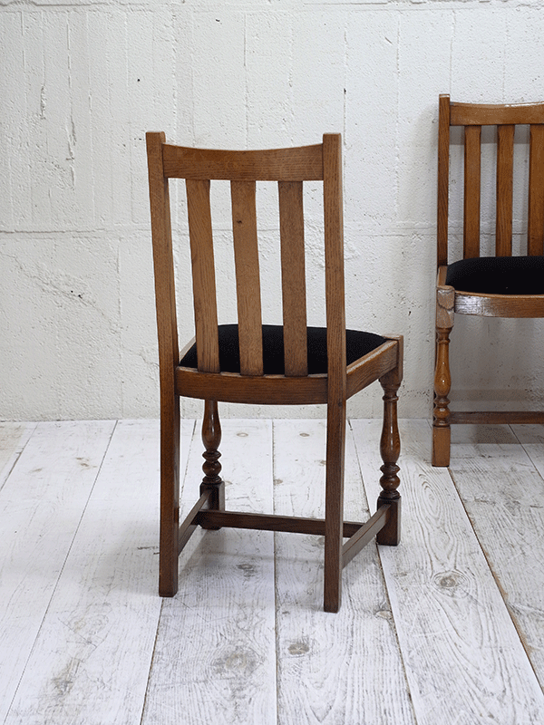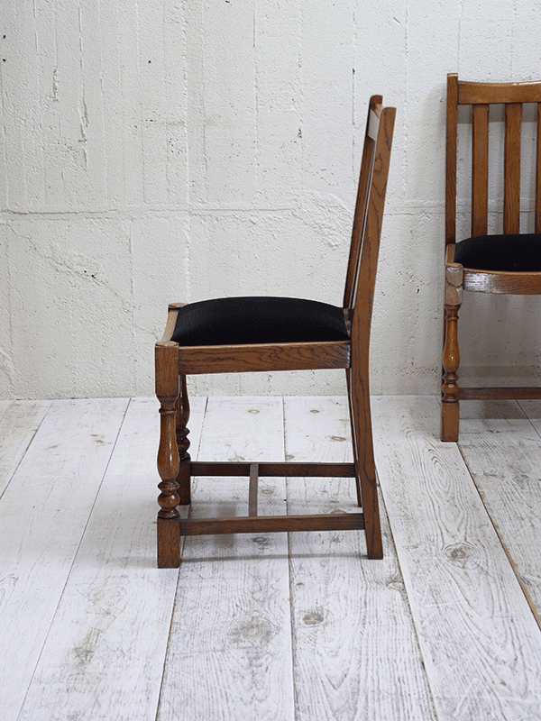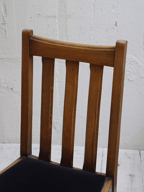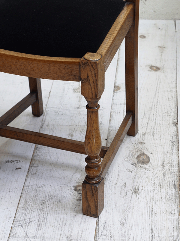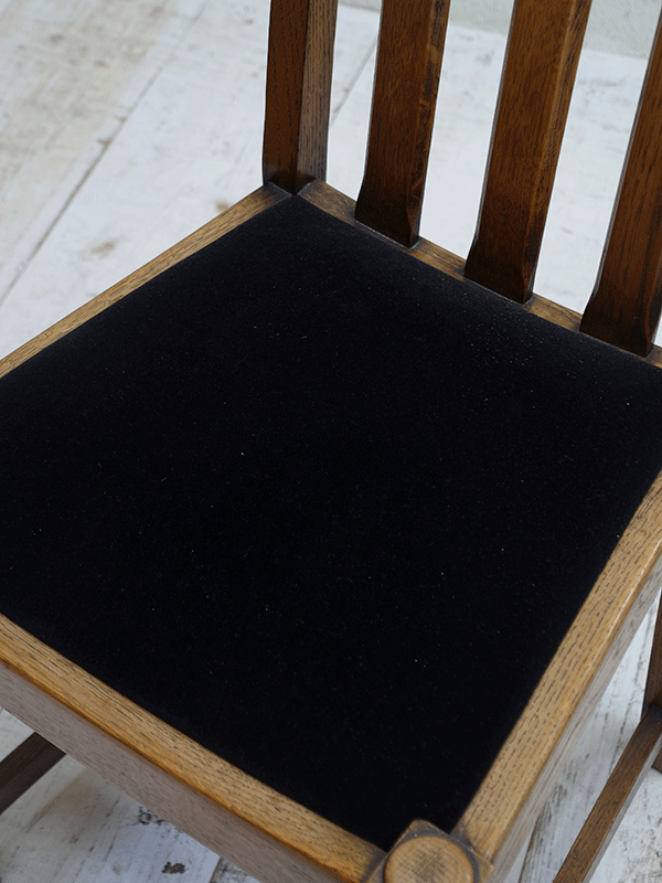 推定1940年代、イギリスアンティークオークチェアです。シンプルなデザインですのでさまざまなタイプにダイニングテーブルに合わせることができます。座面は入荷後にモケット生地で張替えています。