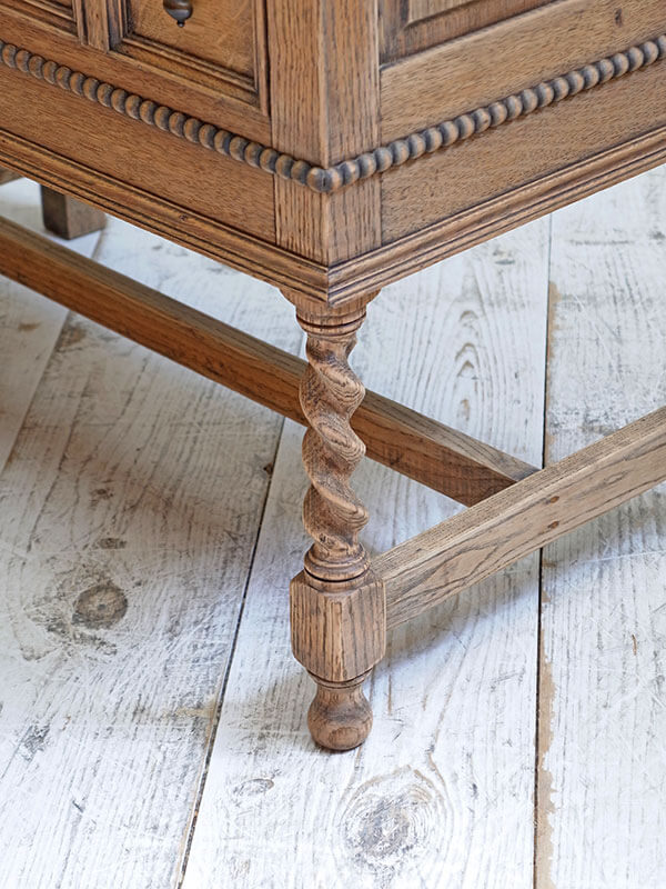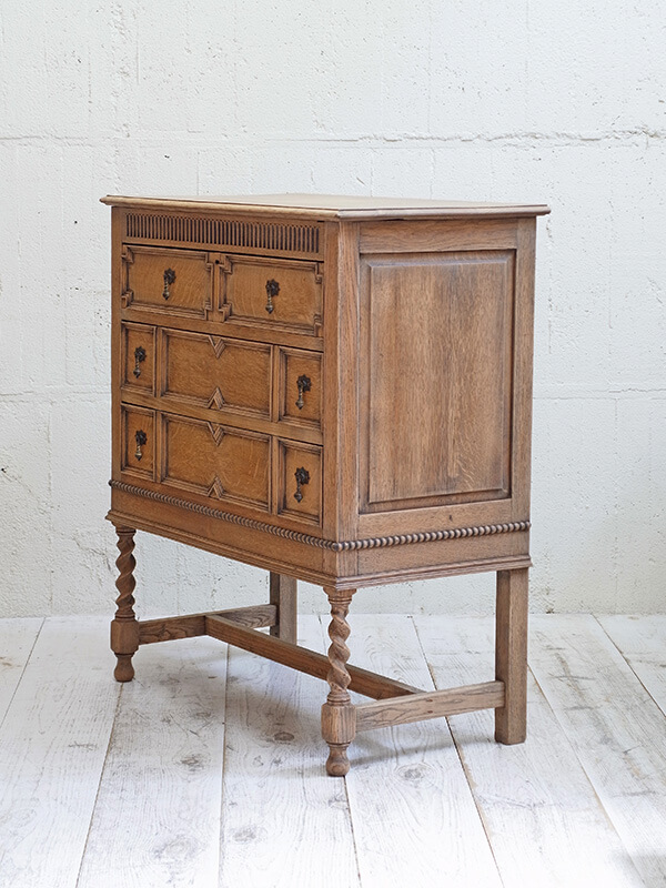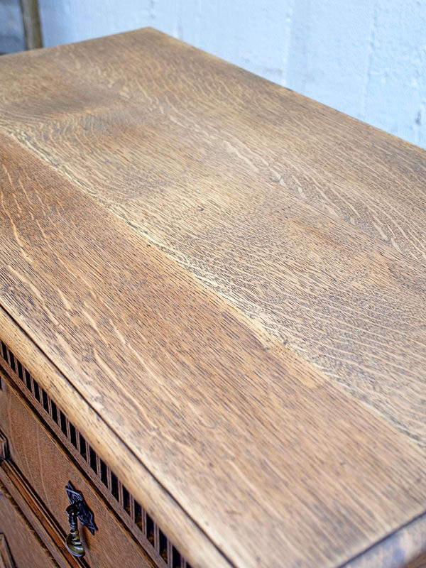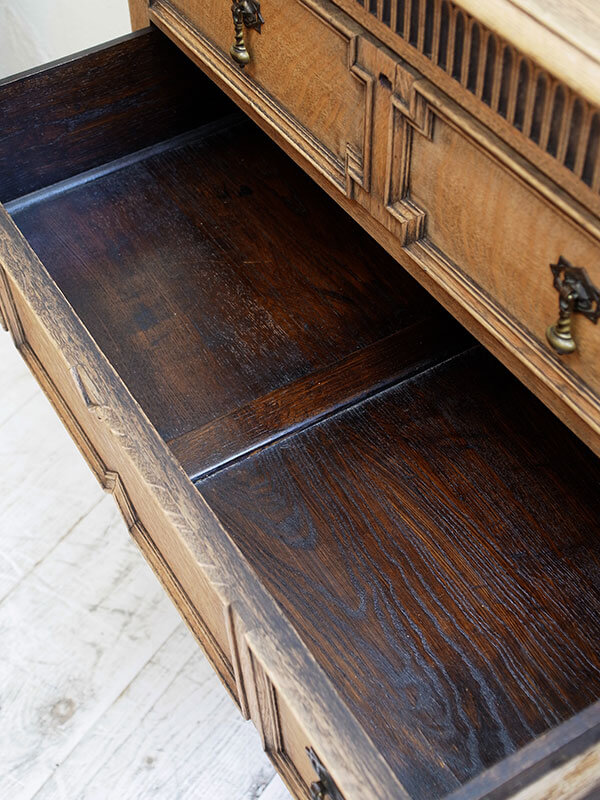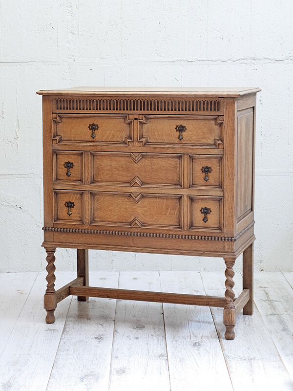 推定1920年代、イギリス製。 使いやすいサイズの定番スタイルのオークチェストです。 天板までの高さ935ミリ 引き出し内寸W740 D350 H120-130-130ミリ 濃茶の塗装をストリップ(剥離)して木目をそのまま生かしたチェストです。色が明るくなったことで様々なインテリアスタイルに取り入れやすい雰囲気になりました。状態も良好です。