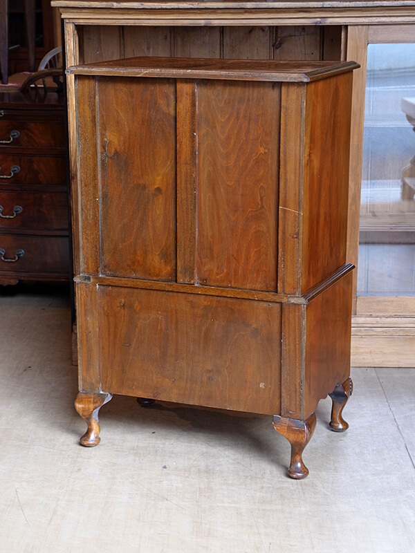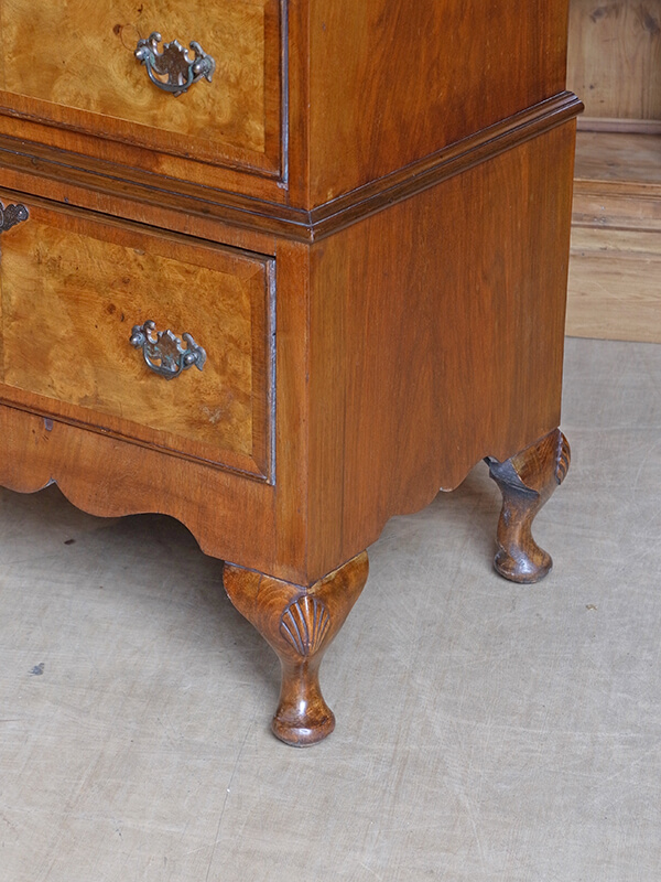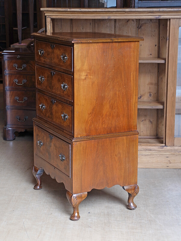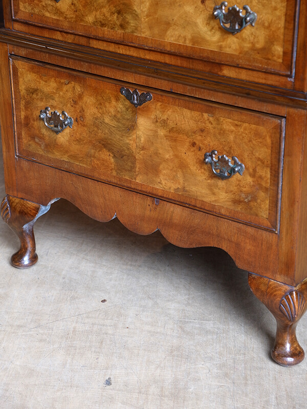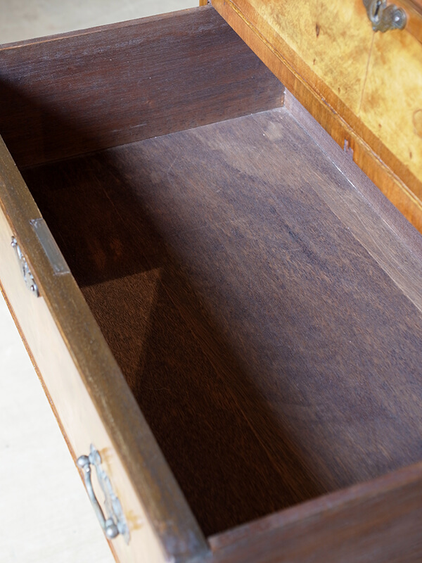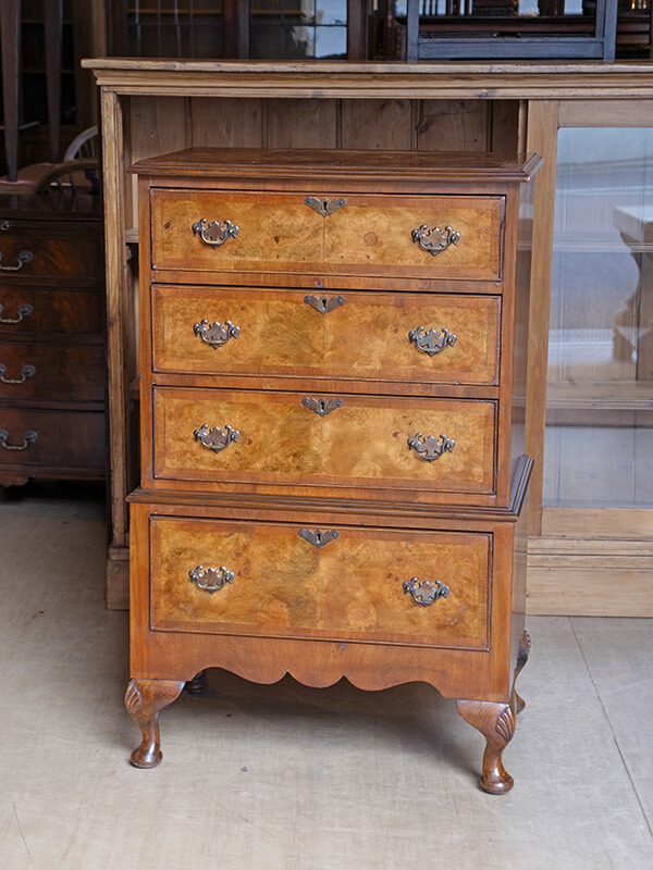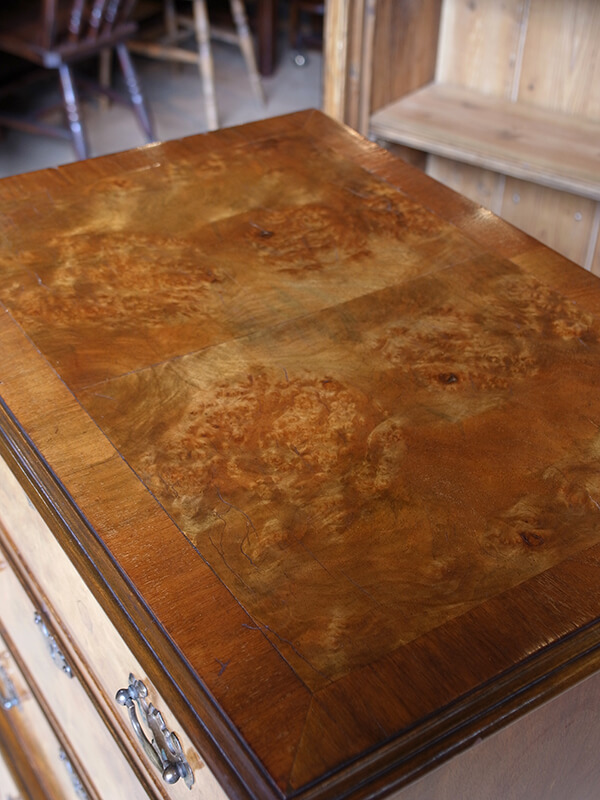 推定1920年代、イギリス製。 上台と下台に分かれるように見えますが一体型のチェストです。 ウォルナットの美しい木目が特徴的です。奥行がしっかりあり、4杯の引き出しでも大容量です。 内寸W540 D330 H115/130/140/180ミリ