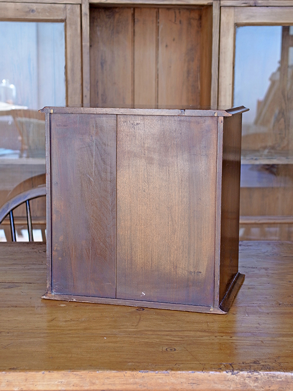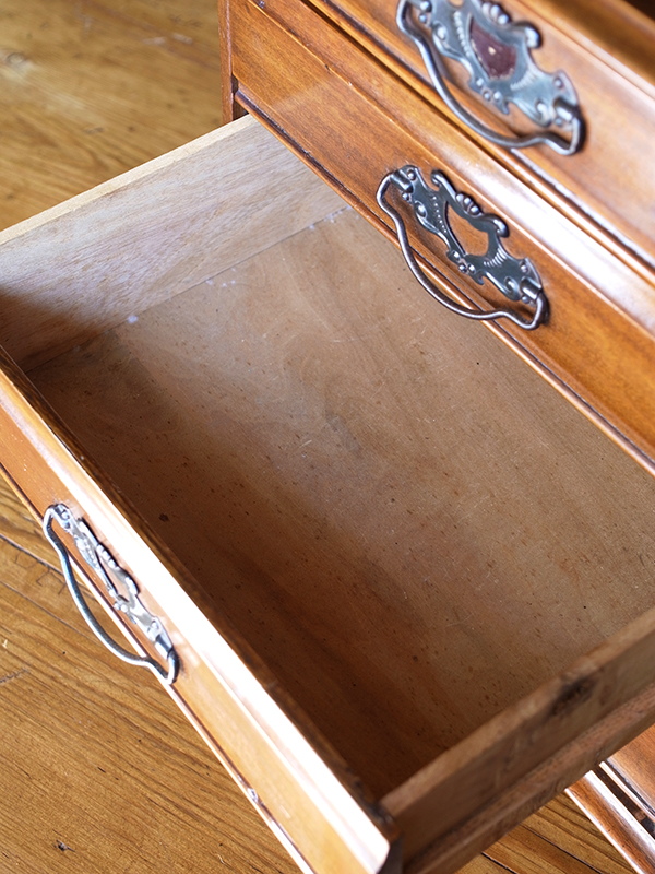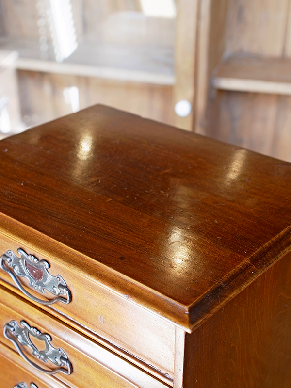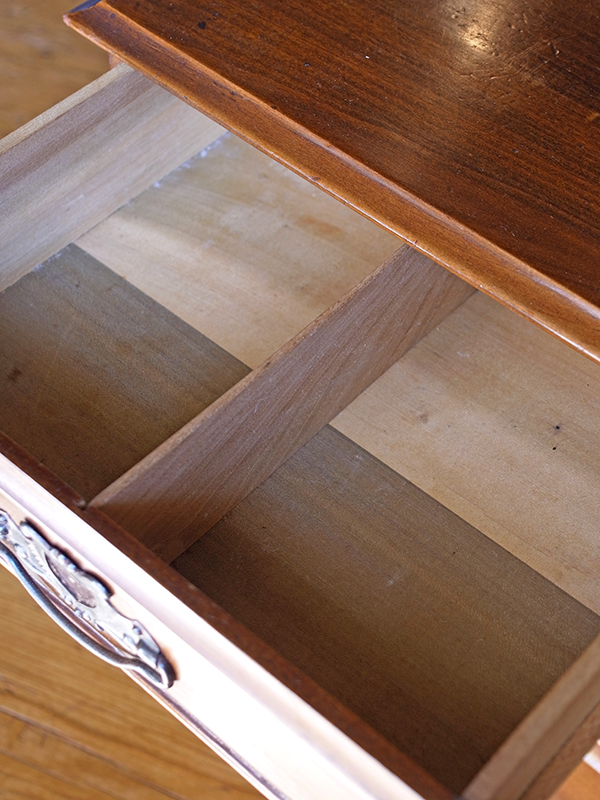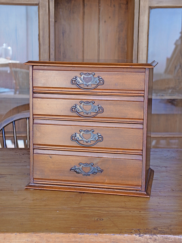 推定1930年代、イギリス製。 引き出し内寸 仕切りあり 1マス W135 D220 H60ミリ × 2 引き出し内寸 仕切りなし W270 D220 H75/90ミリ 細々した小物の収納に最適な小さなチェストです。1段目と2段目の引き出し内には仕切りがついているのでさらに収納しやすくなっています。 下段の引き出しは深めになっています。